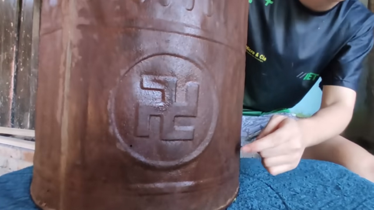 “O tonel nas mãos dele tem o mesmo modelo do tonel identificado em Santo Cristo (RS), com suástica do tipo Omote Manji (suástica Budista) ao centro; alças… Ele foi cortado ao meio, para alguma outra utilização. Saiu da mesma fábrica, da Shell Mex Argentina”, enfatizou o profissional.