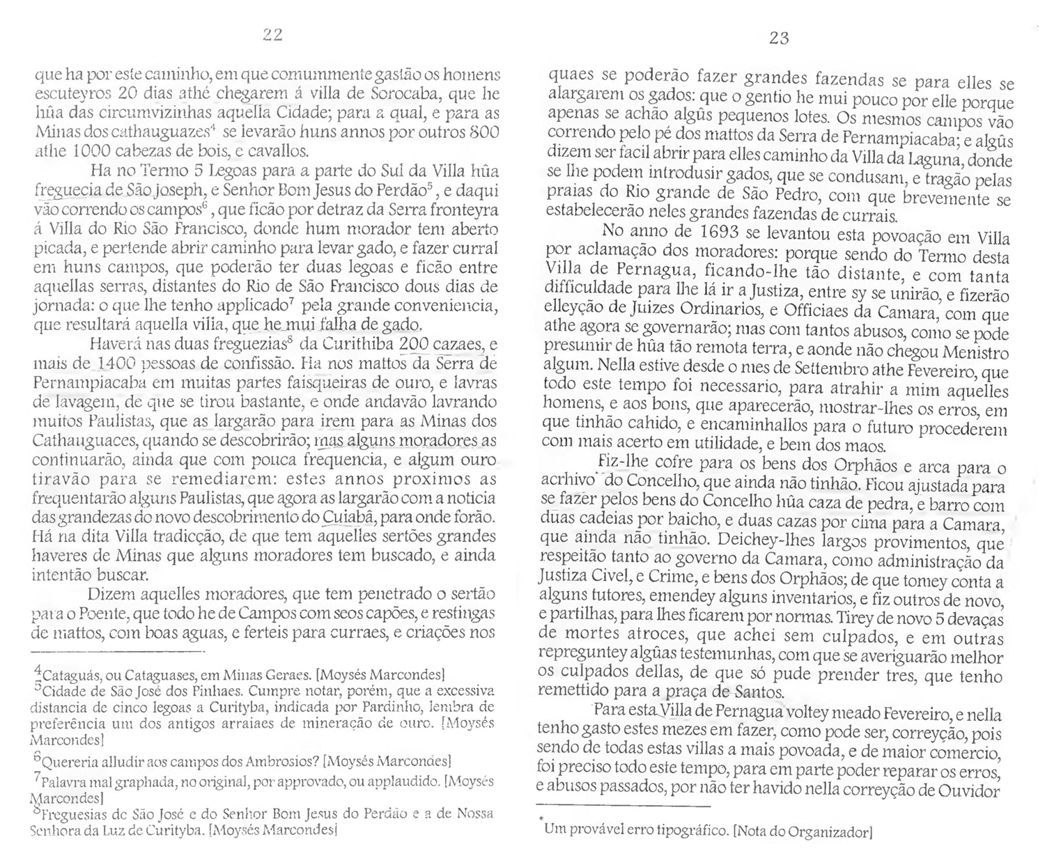 Haverá nas duas freguezias 8 da Curithiba 200 cazaes, e mais de 1400 pessoas de confissão. Ha nos mattos da Serra cie Pernampiacaba em muitas partes faísqueiras de ouro, e lavras de lavagem, de que se tirou bastante, e onde andavão lavrando muitos Paulistas, que as largarão para irem para as Minas dos Cathauguaces, quando se descobrirão; maiglguns moradores as continuarão, ainda que com pouca frequência, e algum ouro tiravão para se remediarem: estes annos próximos as frequentarão alguns Paulistas, que agora as largarão com a noticia das grandezas do novo descobrimento do Cuiabá, para onde forão. Há na dita Villa tradicção, de que tem aquelles sertões grandes haveres de Minas que alguns moradores tem buscado, e ainda intentão buscar. Dizem aquelles moradores, que tem penetrado o sertão para o Poente, que todo he de Campos com seos capões, e restingas de mattos, com boas aguas, e férteis para curraes, e criações nos ^Cataguás, ou Cataguases, em Minas Geraes. [Moysés Marcondes] "Cidade de São José dos Pinhaes. Cumpre notar, porém, que a excessiva distancia de cinco legoas a Curityba, indicada por Pardinho, lembra de preferência um dos antigos arraiaes de mineração de ouro. [Moysés Marcondes] D Quereria alludir aos campos dos Ambrosios? [Moysés Marcondes] ^Palavra mal graphada, no original, por approvado, ou applaudido. [Moysés Marcondes] ^Freguesias de São José e do Senhor Bom Jesus do Perdão e a de Nossa Senhora da Luz de Curityba. [Moysés Marcondesj 23 quaes se poderão fazer grandes fazendas se para elles se alargarem os gados: que o gentio he mui pouco por elle porque apenas se achao algús pequenos lotes. Os mesmos campos vão correndo pelo pé dos mattos da Serra de Pernampiacaba; e akus dizem ser fácil abrir para elles caminho da Villa da Laguna, donde se lhe podem mírodusir gados, que se condusam, e tragão pelas praias do Rio grande de São Pedro, com que brevemente se estabelecerão neles grandes fazendas de currais. No anno de 1693 se levantou esta povoação em Villa por aclamação dos moradores: porque sendo do Termo desta Villa de Pernagua, ficando-lhe tão distante, e com tanta difficuldade para lhe lá ir a Justiza, entre sy se unirão, e fizerão elleyçao de Juizes Ordinários, e Officiaes da Camará, com que athe agora se governarão; mas com tantos abusos, como se pode presumir de hua tão remota terra, e aonde nào chegou Menistro algum. Nella estive desde o mes de Settembro athe Fevereiro, que todo este tempo foi necessário, para atrahir a mim aquelles homens, e aos bons, que aparecerão, mostrar-lhes os erros, em que tmhão cahido, e encaminhallos para o futuro procederem com mais acerto em utilidade, e bem dos mãos. Fiz-lhe cofre para os bens dos Orphãos e arca para o acrhivo do Concelho, que ainda não tinhão. Ficou ajustada para se fazer pelos bens do Concelho hua caza de pedra, e barro com duas cadeias por baicho, e duas cazas por cima para a Camará, que ainda não tinhão. Deichey-lhes largos provimentos, que respeitão tanto ao governo da Camará, como administração da Justiza Civel, e Crime, e bens dos Orphãos; de que tomey conta a alguns tutores, emendey alguns inventários, e fiz outros de novo, e partilhas, para lhes ficarem por normas. Tirey de novo 5 devaças de mortes atroces, que achei sem culpados, e em outras repreguntey alguas testemunhas, com que se averiguarão melhor os culpados delias, de que só pude prender três, que tenho remettido para a praça de Santos. Para est&yilla de Pernagua voltey meado Fevereiro, e nella tenho gasto estes mezes em fazer, como pode ser, correyção, pois sendo de todas estas villas a mais povoada, e de maior comercio, foi preciso todo este tempo, para em parte poder reparar os erros, e abusos passados, por não ter havido nella correyção de Ouvidor Um provável erro tipográfico. [Nota do Organizador] 24 desde o anno de 1682, em que a ella veio o Doutor André da Costa Moreira. Ha na entrada desta Villa duas Ilhas, a que chamão do Mel, e das Fezas 9 , que lhe fazem três barras, duas baichas, em que arrebenta o mar, e por ellas só entrão barcos pequenos, e a do meio hé a maior, e por ella entrão embarcações grandes; mas não de todo o lote, por ter fora hum banco de área, que necessita de pratico. Dentro faz duas grandes bahias com algúas Ilhas, e quantidade de peiche, de que o comum dos homens tratão: e nellas desaguão vários rios caudelosos, e dizem, que navegáveis alguns dias, que ainda estão despovoados, por estes moradores estarem cituados da villa, e a maior distancia athe 5 ou 6 legoas. Tratão aqui mais que nas circumvisinhas da lavoura de mandioca, de que fazem farinhas, que bastantes embarcações vem aqui carregai; e com que se provê a Villa de Santos, e muyta vay para o Rio de janeiro, e alguns annos também para a Bahia.