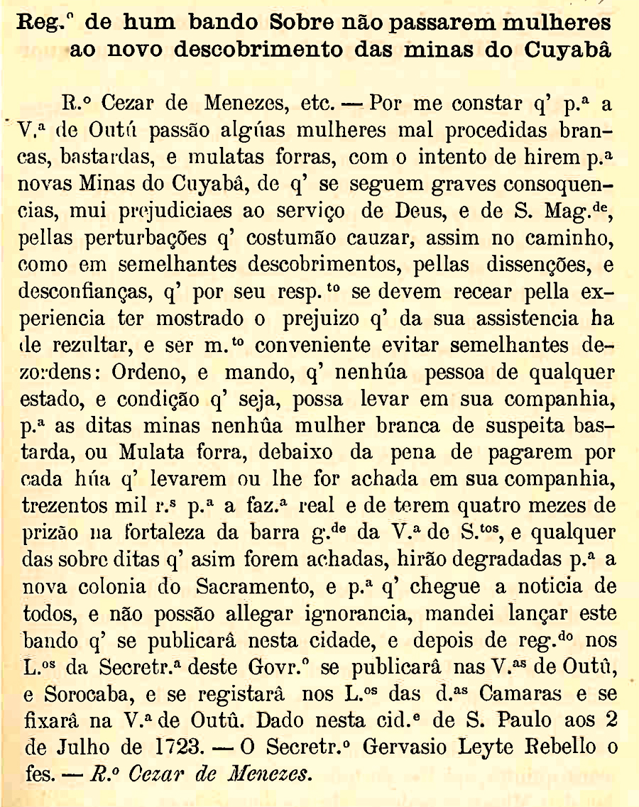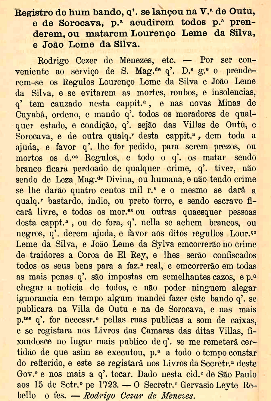 Ordem para todos prenderem os matarem João e Lourenço Leme Data:05/09/1723 Crédito/autor: Crédito/Fonte: Documentos Interessantes