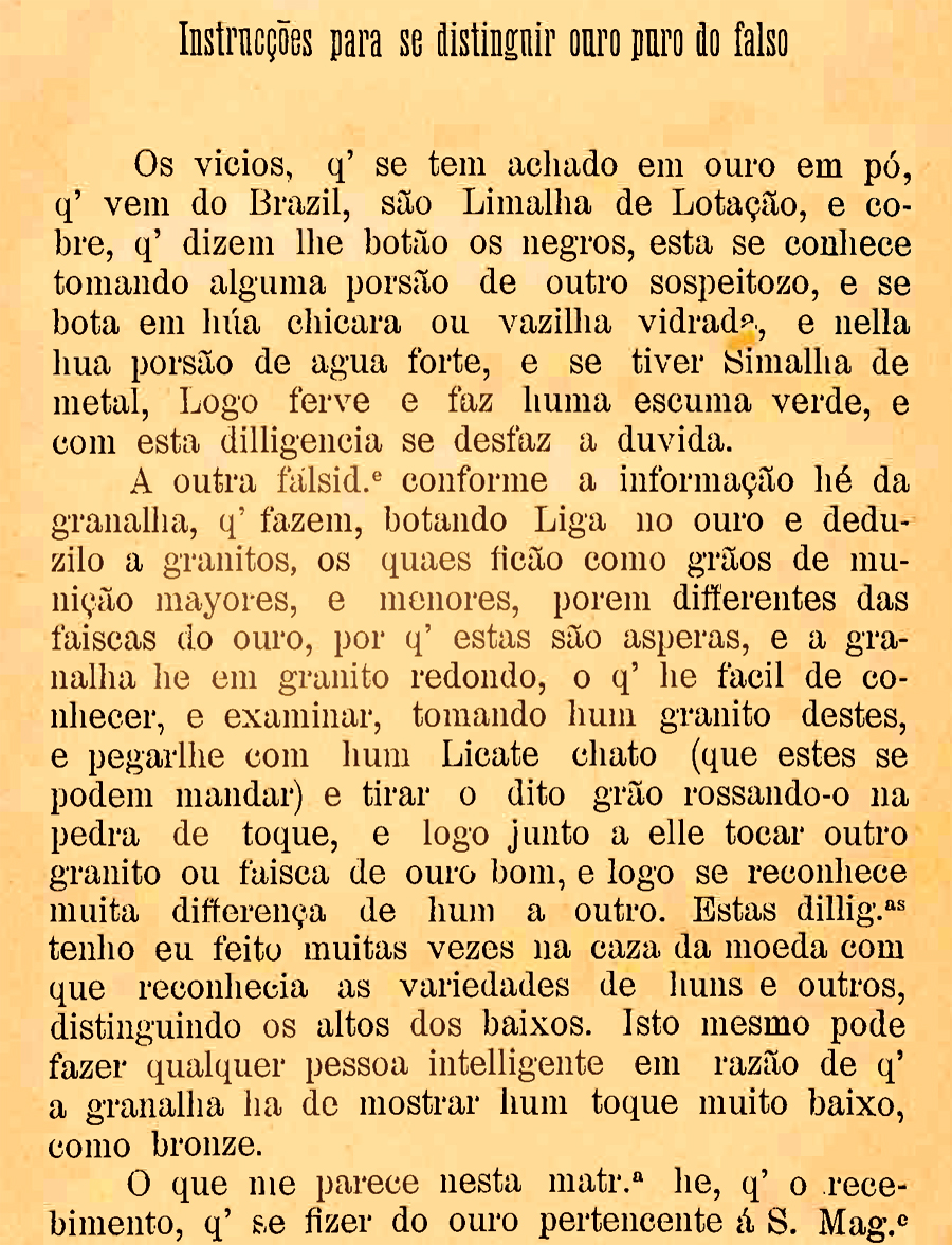 Instruções para se distinguir o ouro puro do falsoData:13/03/1736 Crédito/autor: Documentos Interessantes