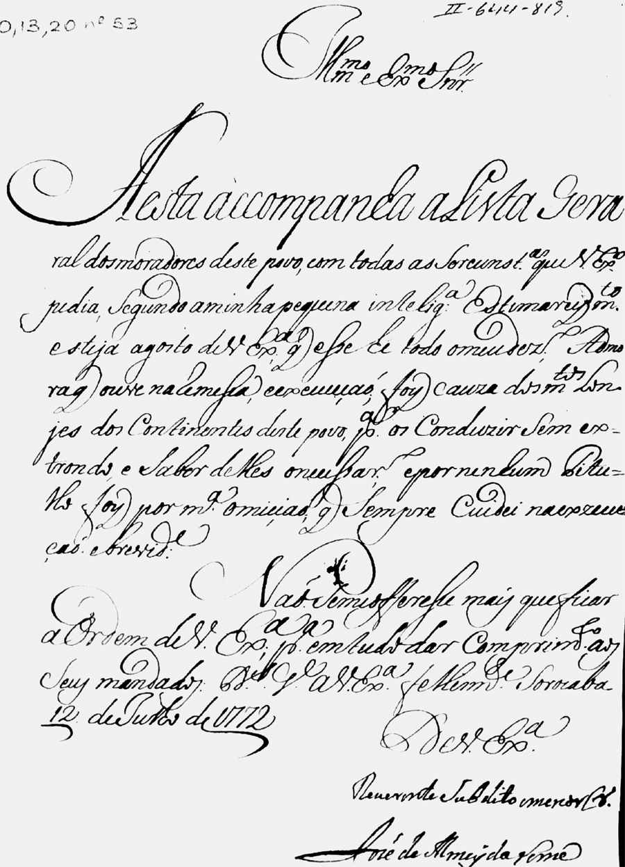 4 de dezembro de 1772, sexta-feira [CARTA anônima dirigida ao governador da Capitania de São Paulo Luís Antônio de Sousa Botelho Mourão, denunciando o Clérigo José Pais de Almeida como perturbador da ordem social e difamador das mulheres da região.]