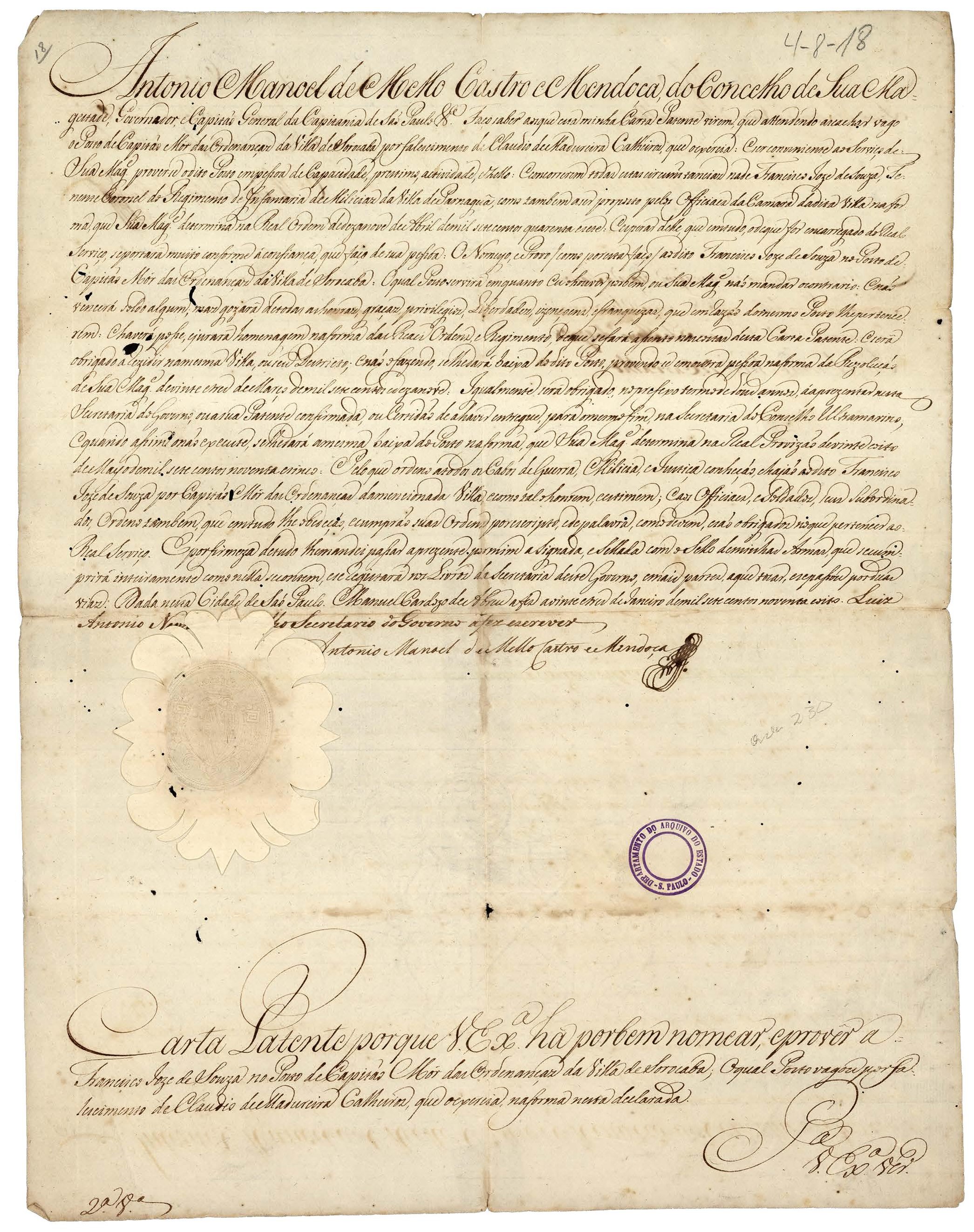 Crédito/Fonte: Wikicommons Carta-patente nomeando Francisco José de Sousa ao posto de capitão-mor de ordenanças da Vila de Sorocaba Data:24/01/1798