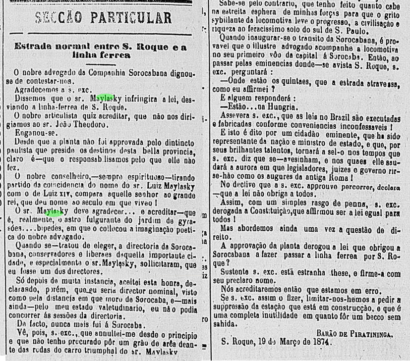 Texto do Barão de Piratininha Data:19/03/1874