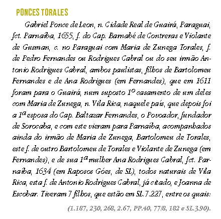 Gabriel Ponce de Leon, n. Cidade Real de Guairá, Paraguai, fct. Parnaíba, 1655, filha do Capitão Barnabé de Contreras e Violante de Gúsman, casado no Paraguai com Maria de Zunega e Torales, filha de Pedro Fernandes ou Rodrigues Cabral ou do seu irmão Antonio Rodrigues Cabral, ambos paulistas, filhos de Bartolomeu Fernandes e de Ana Rodrigues (ou Fernandes), que em 1611 foram para o Guairá, num suposto primeiro casamento de um deles com Maria de Zunega, nascida em Vila Rica, naquele país, que depois foi a primeira esposa do Capitão Baltazar Fernandes, o Povoador, fundador de Sorocaba, e com este vieram para Parnaíba, acompanhados ainda do irmão de Maria de Zunega, Bartolomeu de Torales, este filho de outro Bartolomeu de Torales e Violante de Zunega (em Fernandes), e de sua primeira mulher Ana Rodrigues Cabral, falecida em Parnaíba em 1634 (em Raposos Góes, de Silva Leme), todos naturais de Vila Rica, esta filha de Antonio Rodrigues Cabral, já citado, e Joanna de Escobar.