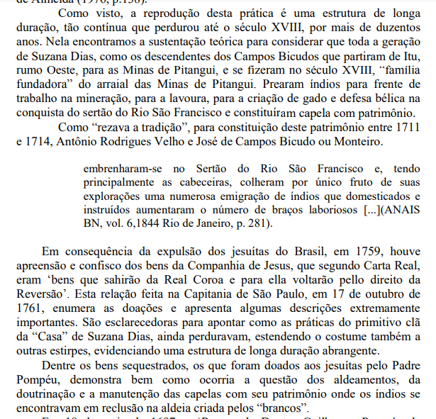 Registros mencionados (14): 01/01/1553 - *Nascimento de Suzana Dias. Filha de Lopo Dias e da nativa Bartira 14/07/1601 - Francisco Rodrigues recebeu de D. Francisco de Souza uma sesmaria de uma légua em quadra, rio Sarapui abaixo, além do morro do Araçoiaba, desde a tapera de “Ibapoara”, topônimo desconhecido 14/07/1601 - Dom Francisco mudou o pelourinho, enviou moradores mas somente os "Sardinha" tinha autorização de entrar nas minas de "Obiracoyava" 15/08/1603 - Após a descoberta do ouro em terras brasileiras, Portugal instituiu várias medidas de caráter fiscalizador com o chamado “Primeiro regimento das terras minerais” 01/06/1610 - Francisco de Souza chega em São Paulo* 01/07/1610 - *Sorocaba (data estimada) 10/06/1611 - O triste destino de D. Francisco de Souza, fundador do Itavuvu e 7° Governador-Geral do Brasil 16/04/1616 - Inventário e Testamento e Antonio Rodrigues, genro de Suzana Dias e Manuel 01/01/1620 - *Antonio Bicudo ganha destaque / início da colonização das Minas de Pitangui 02/09/1634 - Falecimento de Suzana Dias 01/01/1643 - *Casamento de Margarida Bicudo e Felipe de Campos Bander Borth 01/12/1681 - Testamento de Felipe de Campos 12/01/1759 - *Jesuítas são expulsos do Brasil 19/09/2024 - Quais são as 10 MAIORES TRIBOS INDÍGENAS brasileiras? Conhecendo o Brasil (Youtube.com)