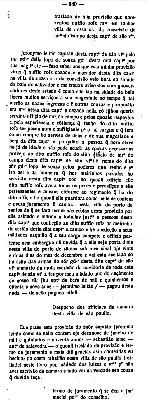 Registros mencionados (19): 22/01/1502 - André Gonçalves e Américo Vespúcio descobrem o porto, a que deram o nome de Rio de São Vicente / Cruz de Pedra 07/03/1608 - Carta de dada de terras de Diogo de Onhate que lhe deu o capitão Gaspar Conqueiro no caminho de aldeia de Tabaobi 06/08/1608 - Terras 03/04/1609 - “muita gente que se vinha para cá, por outro caminho (...) paragem chamada Atuahy (Itú), perto de Piassaba, e perto donde vivia Baltezar”: O relato de André da Aldeia do Forte 16/05/1609 - Sesmarias de 1602-1642, Publicação Oficial do Arquivo do Estado de São Paulo, impresso pela Tipografia PiratiningaData: 1921 03/10/1609 - Sesmarias de 1602-1642, Publicação Oficial do Arquivo do Estado de São Paulo, impresso pela Tipografia PiratiningaData: 1921 16/11/1609 - A primeira carta de sesmaria concedida junto às terras dos índios do aldeamento de São Miguel data de 16 de novembro de 1609, em nome de Maria Alvares 10/12/1609 - Terras 02/01/1610 - Terras 06/02/1610 - Traslado de uma carta de dada de Terras de Henrique da Costa morador em São Paulo 01/07/1610 - Traslado de uma carta de dada de terras de Henrique da Costa morador em São Paulo: “Anhambi meia legua de terras, de Viraçoyaba assim e da maneira” 26/12/1610 - Belchior da Costa aumenta suas terras, “alega ter as filhas Beatriz Diniz e Vicência da Costa para casar. Pede terras em frente às de Suzana Dias, defronte à capela de Santana do Pernaiba, na banda do além Anhembi” 17/06/1614 - Registro de uma carta de dada de terras a Manuel João Branco 09/06/1617 - Registo da carta de dada de terra de Antonio Soares e de Antonio Fernandes Góes morador no Rio de Janeiro passada pelo capitão Balthazar de Seixas Rebello que é a seguinte 10/11/1637 - Terras 20/02/1639 - Traslado de uma Carta de terras de sesmaria de Gaspar Gomes morador na Villa de São Paulo 18/08/1639 - Terras 01/10/1642 - Registo da carta de dada de terras de sesmaria ao capitão Sebastião Fernandes morador na villa de São Paulo* 04/05/2023 - Leis, consultado em camarapirapozinho.sp.gov.br Lopo de Souza Imagens (3º de 15 )