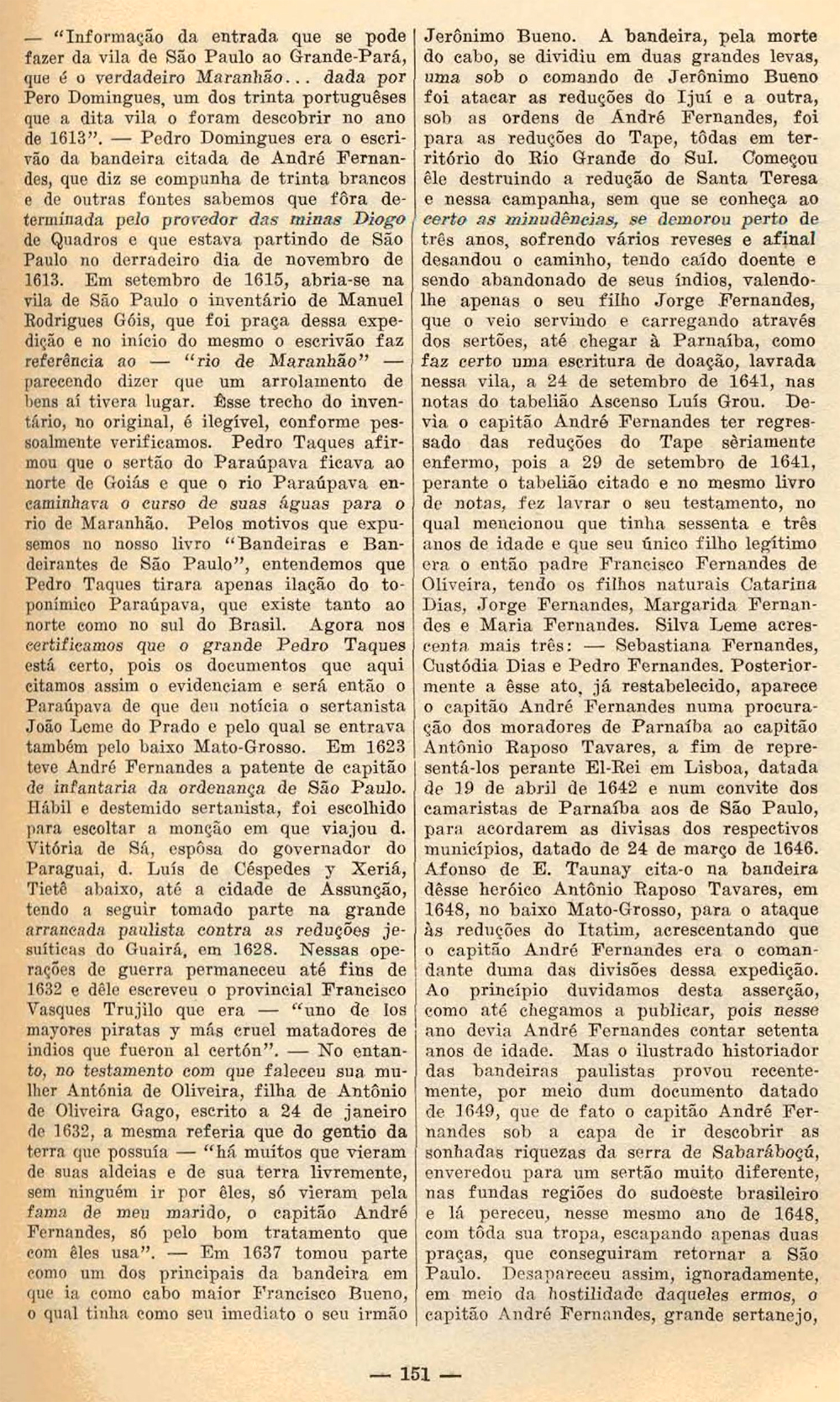 Registros mencionados (38): 31/01/1531 - A esquadrilha portuguesa de Martim Afonso de Sousa avista a costa do Brasil na altura do cabo Percaauri 01/12/1561 - Expedição de Mem de Sá / O português Manuel Fernandes Ramos, primeiro marido de Suzana Dias construiu a capela de Santo Antônio* 01/01/1575 - *A história da Freguesia do Ó, bairro da região norte de São Paulo começa com a vinda do português Antônio Preto de São Vicente para São Paulo onde assumiria as funções de juiz Ordinário da Câmara 01/01/1578 - *Nascimento de André Fernandes, filho de Manuel Fernandes Ramos e Suzana Dias 01/01/1580 - *Nascimento de Balthazar Fernandes no Ibirapuera, filho de Manuel Fernandes Ramos (português) e Suzana Dias 01/01/1580 - *O pai de Manuel Preto partindo de Piratininga acompanha o Rio Tietê aportando na margem direita em um areal, uma légua e meia (cerca de 9 km) da antiga vila 01/06/1581 - Oficializou-se a entrega da capela através de uma carta de doação e assinada, inclusive, pelo autor do Tratado Descritivo do Brasil, Gabriel Soares de Sousa* 01/01/1582 - *Luís Eanes Grou (1554-1590) obteve, do Cap. Mor Jerônimo Leitão, sesmaria de uma légua de terras em Quitaúna 01/01/1588 - *Apesar da saúde frágil, Manuel Fernandes Ramos continuava exercendo atividades como vereador na Câmara de São Paulo 01/01/1589 - *Fundação da Usina de Ferro do Vale das Furnas 07/12/1589 - “Manoel Fernandes falecido (...) requerimento do procurador do conselho Gonçalo Madeira que se fizesse a ponte grande que esta caminho de tejuguasu e que se consertassem todas as mais pontes e caminhos de Ipiranga, Birapoeira, Pinheiros e da Ambuasava” [Atas da Câmara de São Paulo (7.12.1589) p. 374 e 275] 01/01/1600 - *As terras de Tibiriçá foram doadas em caráter perpétuo aos beneditinos 01/01/1610 - *Frei Mauro Teixeira ausentando-se da vila deixa como procurador e protetor da pequena capela de São Bento nada menos que o temível bandeirante Manuel Preto 02/02/1610 - Domingos Fernandes (33 anos) funda a cidade de Itu 01/06/1610 - Francisco de Souza chega em São Paulo* 26/07/1610 - Suzana Dias, a matrona bandeirante, representando a família dos Fernandes, doa um terreno na parte mais elevada do núcleo para a construção de uma capela em homenagem à Santana substituindo a anterior dedicada a Santo Antônio 01/01/1622 - *Fundação 01/01/1625 - *Falecimento de Belchior da Costa, filho de Manuel da Costa e Beatriz Diniz 14/11/1625 - Capela feita matriz / Criada a vila de Parnaíba por provisão do conde de Monsanto, donatário da capitania 01/01/1627 - *Reduções 04/08/1627 - A terceira entrada e a fundação da Redução dos Arcanjos 01/01/1628 - *“Do lado espanhol” 18/09/1628 - parte de São Paulo a grande bandeira comandada por Raposo Tavares tendo como imediato Manoel Preto que atacou as reduções jesuíticas e aldeias guaranis, com 69 portugueses, 900 mamelucos e 3 mil índios 22/07/1630 - Falecimento de Manoel Preto, filho de Antonio Gomes Preto e Antonia Gonçalves Lage Antunes 02/09/1634 - Falecimento de Suzana Dias 21/02/1635 - Certifico eu Frei Alvaro de Caravajal pior (...) de Nossa Senhora de Monserrate da ordem do Patriarca SP (...) padre nesta vila de São Paulo, que recebi do Cap. Balthazar Fernandes de Parnaíba a esmola de dez missas que eu me obriguei a dizer e são em descargo do testamento de sua mãe defunta que ele como testamenteiro mandou fazer e por ser verdade lhe dei este por mim assinado hoje 30/07/1635 - Documento 01/01/1641 - *Nossa Senhora do Rosário, uma das primeiras obras do escultor encontradas no Planalto Paulista 14/11/1643 - Fundada a vila da Parnaiba, sendo o mosteiro Mosteiro de Nossa Senhora do Desterro de Santana de Parnaíba doação do capitão André Fernandes 01/01/1646 - *“A Matriz de Santana de Parnaíba, reconstruída em 1646 e finalizada por volta de 1650” 01/01/1654 - *Frei Agostinho permanece no território paulista até aproximadamente 1654 14/07/1659 - O mosteiro de São Bento da Parnaíba foi elevado à categoria de Presidência ou Priorado 01/01/1660 - *Frei Anselmo Batista passou a residir em Sorocaba 10/01/1681 - A Câmara de Parnaíba decide demarcar o rocio da vila: “um ribeiro que fica por cima do moinho da vila e subindo por a capoeira deu em um têso que fica por baixo da casa de sobrado que foi de Balthazar Fernandes” 26/06/1681 - Primeira notícia do falecimento 04/11/1681 - Falecimento de Fernão Dias Paes Leme (data estimada) 01/01/1720 - *Os beneditinos substituem a antiga padroeira do Mosteiro de São Bento em São Paulo, Nossa Senhora do Montesserrate, autoria de Frei Agostinho da Piedade por um novo orago 01/01/2012 - *TEMPLOS, CASAMENTOS E CEMITÉRIOS DE UM GRUPO OUTSIDER. Luiz Cândido Martins, Luciana Fernandes Volpatover (n.1560) º de (27)