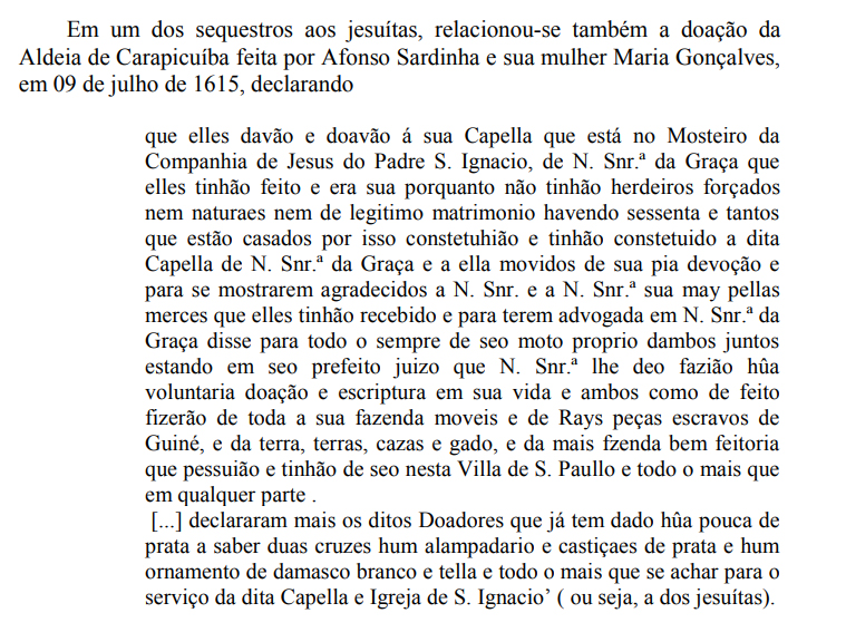 0CARTA DE BALTHAZAR FERNANDES (233), DO BRASIL, DA CAPITANIA DE S. VICENTE DE PIRATININGA AOS 5 DE DEZEMBRO DE 1567.5 de dezembro de 1567, terça-feira. Atualizado em 25/02/2025 04:41:34 Relacionamentos • Cidades (7): Cabo Frio/RJ, Itanhaém/SP, Rio de Janeiro/RJ, Santos/SP, São Paulo/SP, São Vicente/SP, Sorocaba/SP • Pessoas (7) José de Anchieta (33 anos), Luís da Grã (n.1523), Manuel da Nóbrega (50 anos), Padre Balthazar (31 anos), Mem de Sá (67 anos), Manoel de Chaves, Vicente Rodrigues • Temas (23): Cabo Frio, Caminho do Mar, Capitania de São Tomé, Capitania de São Vicente, Capitania do Rio de Janeiro, Carijós/Guaranis, Gentios, Ouro, São Paulo de Piratininga, Vinho, Cristãos, Léguas, Algodão, Açúcar, Inferno, Caciques, Cruzes, Piratininga, Gados, Trópico de Capricórnio, Dinheiro$, Assassinatos, NeveRegistros mencionados (2)22/02/1567 - Início da Quaresma [575]24/07/1567 - Chegada [576] “Itaquaquecetuba em tempos coloniais: a função social do aldeamento de Nossa Senhora da Ajuda na ocupação do planalto da Capitania de São Vicente (1560-1640)”. Diana Magna da Costa2021. Atualizado em 23/10/2025 17:19:58 Relacionamentos • Cidades (9): Carapicuiba/SP, Curitiba/PR, Guarulhos/SP, Itanhaém/SP, Itaquaquecetuba/SP, Mogi das Cruzes/SP, Santos/SP, São Paulo/SP, Sorocaba/SP • Pessoas (20) Alfredo Ellis Júnior (3 anos), Amador Bueno de Ribeira (1584-1649), Antonio de Aguiar Barriga (1600-1655), Belchior da Costa (1567-1625), Belchior Dias Carneiro (1554-1608), Custódio de Paiva, Diogo Ordonhez de Lara (1550-1602), Domingos Afonso, Gaspar Gonçalves Conqueiro, Gaspar Vaz Guedes (n.1560), Gregório Ramalho, Jerônimo Leitão, João Ramalho (1486-1580), José de Anchieta (1534-1597), Lopo Dias Machado (1515-1609), Manuel da Nóbrega (1517-1570), Nicolau Barreto, Padre João Alvares, Catarina de Faria, Sergio Buarque de Holanda (1902-1982) • Temas (23): “o Rio Grande”, Boigy, Caminho até Mogi, Caminho de Curitiba, Carijós/Guaranis, Embiacica, Epidemias e pandemias, Goayaó, Guaianase de Piratininga, Nossa Senhora D´ajuda, Nossa Senhora da Escada, NS do Carmo de Santos, Pela primeira vez, Rio Anhemby / Tietê, Rio dos patos / Terras dos patos, Rio Goyaó, Rio Jaguari, Rio Ururay, Sabaúma, Santa Ana de Mogi das Cruzes, Santa Ana de Mogi-Mirim, Ururay, YtacurubitibaRegistros mencionados (16)12/06/1561 - “De maneira que quase todo o dia se gasta em confissões, e se mais intérpretes houvera, muito mais se confessavam, e não é pequena desconsolação vê-los estar todo o dia esperando na Igreja” [21908]01/06/1590 - Jerômilo Leitão ordenou um reconhecimento prévio do local* [19964]03/12/1593 - As primeiras notícias que temos sobre a região de Mogi pelas atas da câmara [25173]05/12/1593 - Depoimento sobre o ataque a Antonio de Macedo e Domingos Luis Grou no rio Jaguari: Manoel Fernandes uma das vítimas [20496]05/02/1595 - Diogo de Lara assinou na Câmara [21472]13/06/1601 - Requerimento apresentado aos oficiais da câmara [32091]1610 - Antonio Camacho solicitou terras no Coabussú [23535]07/01/1610 - Traslado de uma carta de dadas de terra de Domingos de Góes morador na Villa de São Paulo [23534]22/03/1610 - Belchior da Costa alega ter as filhas Beatriz Diniz e Vicência da Costa para casar. Pede terras em frente às de Suzana Dias, defronte à capela de Santana do “Pernaiba”, na banda do além Anhembi, rio acima [24074]23/03/1610 - Aos 23 de março do referido ano, padre João Alvares teve sua primeira carta de sesmaria concedida. Este documento está com a maior parte das linhas ilegíveis e por este motivo não foi transcrito na íntegra [25174]1611 - Pedido de Sesmaria [20479]17/08/1611 - Elevação à Vila de Santa Ana de Mogi Morim / Fundação de Mogi das Cruzes [21295]10/09/1611 - Lei de dom Filipe III reconhecendo, em princípio, a liberdade dos índios, mas declarando legítimo o cativeiro dos que fossem aprisionados em justa guerra ou dos que fossem resgatados quando cativos de antropófagos [11902]1627 - Concessões [24716]1639 - Traslado do registo da carta de data de terras de Pantaleão Fernandes dada pelo capitão-mor e ouvidor Antonio de Aguiar Barriga [32088]04/05/2023 - Leis, consultado em camarapirapozinho.sp.gov.br [28192] Doação da Aldeia de Carapicuíba feita por Afonso Sardinha e sua mulher Maria Gonçalves9 de julho de 1615, quinta-feira. Atualizado em 24/10/2025 02:36:25 Relacionamentos • Cidades (4): Carapicuiba/SP, Guiné/AFR, Santos/SP, São Paulo/SP • Pessoas (3) Afonso Sardinha, o Velho (84 anos), Baltazar Gonçalves, velho (71 anos), Maria Gonçalves "Sardinha" (n.1541) • Temas (4): Ermidas, capelas e igrejas, Jesuítas, Nossa Senhora das Graças, Ouro Nomeação8 de agosto de 1600, terça-feira. Atualizado em 24/10/2025 04:14:56 Relacionamentos • Cidades (3): Santana de Parnaíba/SP, São Paulo/SP, Sorocaba/SP • Pessoas (3) Belchior da Costa (1567-1625), Francisco de Sousa (1540-1611), João Soares • Temas (1): Aldeia de São Miguel (Guarapiranga) Fundação da aldeia de Santa Cruz de Itaparicajunho de 1561. Atualizado em 13/02/2025 06:42:31 Relacionamentos • Cidades (3): Itapecirica da Serra/SP, São Paulo/SP, Sorocaba/SP • Temas (4): Jesuítas, Paraguassu, Santa Ana das Cruzes, Santa Cruz de Itaparica “Viagem à provincia de São Paulo e Resumo das viagens ao Brasil, provincia Cisplatina e missões do Paraguai”. Auguste de Saint-Hilaire (1779-1853)1940. Atualizado em 23/10/2025 15:57:13 Relacionamentos • Cidades (15): Araçariguama/SP, Barueri/SP, Carapicuiba/SP, Cotia/Vargem Grande/SP, Cubatão/SP, Guarapuava/PR, Guarulhos/SP, Itapeva/SP, Itu/SP, Porto Feliz/SP, Santana de Parnaíba/SP, Santos/SP, São Paulo/SP, São Vicente/SP, Sorocaba/SP • Pessoas (17) Antônio Pires de Campos, Auguste de Saint-Hilaire (1779-1853), Daniel Parish Kidder (1815-1891), Daniel Pedro Müller (1785-1841), Gaspar da Madre de Deus (1715-1800), Gertrudes Eufrosina Aires (1777-1846), José de Anchi