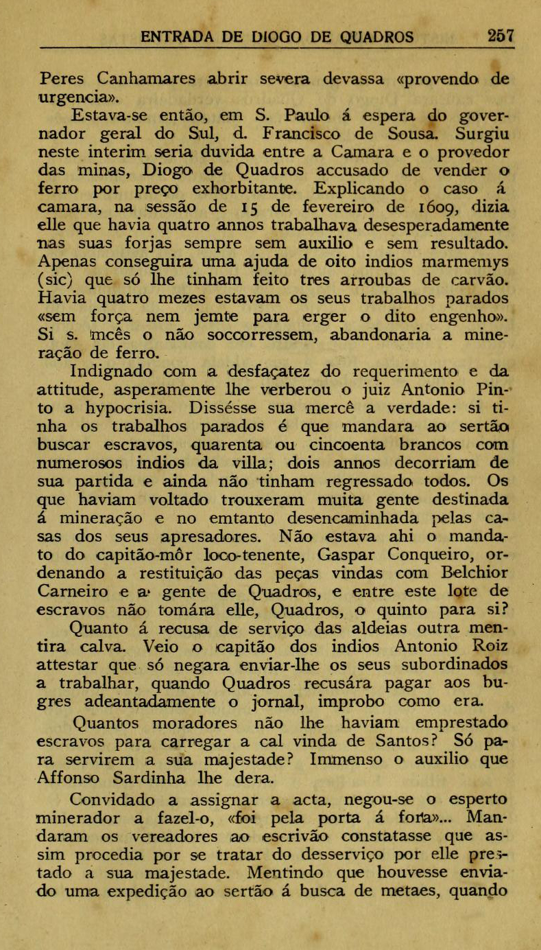 Registros mencionados (26): 01/12/1532 - Caminho da Serra* 01/01/1550 - *Casamento de Afonso Sardinha, "o Velho", e Maria Gonçalves (filha do Mestre Bartholomeu Gonçalves e Antônia Rodrigues, “a índia”) 02/04/1577 - Nascimento de Balthazar Fernandes 01/01/1589 - *Fundação da Usina de Ferro do Vale das Furnas 02/05/1592 - Por patente entre a 2 de maio de 1592, foi entregue a Afonso Sardinha, em substituição a Jorge Correa, o lugar de capitão-mór, pois que a vila estava ameaçada pelo nativo 17/07/1593 - Requeria a suas mercês os mandassem tapar e entupir, a saber, mandasse a Susana Dias que entupisse duas covas que estão na praça que seu filho Francisco Dias fez seu filho Francisco Dias fez e um beco que esta junto com ela 13/02/1594 - Oficiais da Câmara e outras pessoas da governança, lembrando o procurador a Afonso Sardinha “o recado do senhor capitão para estarem todos prestes para a guerra". Ao procurador parecia que tendo Afonso Sardinha "ordem para vigiar os nativos”, não fora isso necessário por não se haver “apresentado gente do sertão”, convindo agora fazê-lo “indo vinte homens brancos a ver o que passava até oo Pirapitinguí” partindo outros a “vigiarem até Sabaúma” 10/06/1594 - Troca entre chãos que Garcia tinha recebido de seu pai e mãe falecidos, com outros de Antonio de Siqueira, morador de Santos 30/06/1594 - Antonio Rodrigues vendeu chãos defronte ao pelourinho a Marcos Sanches de Paredes (Manuel Ramos falecido) 05/02/1595 - Diogo de Lara assinou na Câmara 22/05/1595 - Aguardando que o capitão-mór os viesse acompanhar na entrada contra os nativos do sertão do Mogí, ora a indagar se receberiam auxílio dos de Santos e de São Vicente ou de pediriam aos do Rio de Janeiro, reuniram-se mais uma vez a 22 de maio de 1595 aqueles angustiados moradores da vila de São Paulo de Piratininga 01/01/1597 - *Tem minas de ouro de lavagem nas chamadas de Vuturuna, em cuja terra as descobrio no anno de 1597 o Paulista Afonso Sardinha, como fica referido 08/03/1598 - Acorria o povo a atender a provisão do Governador Geral, D. Francisco de Souza 20/03/1598 - Doze dias após Afonso Sardinha à Câmara, onde novamente tratavam do mesmo assunto e quando, a bem do povo, deliberaram sobre o quanto havia de custar a carne fresca do porco, que tabelaram a "quatorze réis o macho e a fêmea a doze réis e a da vaca fresca a duzentos réis a arroba", confirmando as posturas relativas ao gado e continuando proibida sua venda para Santos, sem licença da Câmara 10/09/1601 - Afonso Sardinha e seu filho Pedro fazem parte do regimento dado ao administrados das minas para que descobrisse as minas 25/11/1601 - sardinha 09/09/1606 - Oficiais da Câmara ainda reclamavam que Afonso Sardinha, o pai 01/09/1607 - Sardinha é eleito vereador* 03/11/1607 - Terras 01/01/1615 - *Fundição criada por Afonso Sardinha no morro Ipanema para de funcionar 09/07/1615 - Doação da Aldeia de Carapicuíba feita por Afonso Sardinha e sua mulher Maria Gonçalves 02/09/1634 - Falecimento de Suzana Dias 29/01/1636 - Balthazar Fernandes deixa o Uruguai com cerca de 400 escravizados* 01/01/1645 - *Tomada da fundição de Balthazar Fernandes e sua possível chegada a Sorocaba 01/12/1654 - Balthazar Fernandes se estabeleceu definitivamente na região, com família e 380 escravizados* 16/02/2023 - Balthazar Fernandes: Culpado ou Inocente? Gaspar Gonçalves Conqueiro Imagens (2º de 27 )