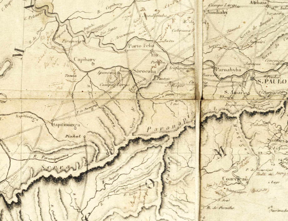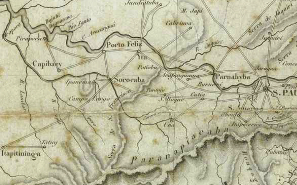 Mapa produzido pela Diretoria geral de Obras Públicas (data estimada) 1840. Atualizado em 26/10/2025 18:28:19 Relacionamentos • Cidades (3): Araçoiaba da Serra/SP, Itapetininga/SP, Sorocaba/SP • Temas (17): Bacaetava / Cahativa, Bairro Itavuvu, Caminho do Itanguá, Caminho Sorocaba-Itapetininga, Córrego Supiriri, Estradas antigas, Fazenda Ipanema, Geografia e Mapas, Jardim Itanguá / Manchester, Lagoas, Rio Itanguá, Rio Pirajibú, Rio Sorocaba, Rio Ypanema, Rodovia Raposo Tavares, Rua Hermelino Matarazzo (Estrada de Ipanema), Vila Santana / Além Linha ![]()