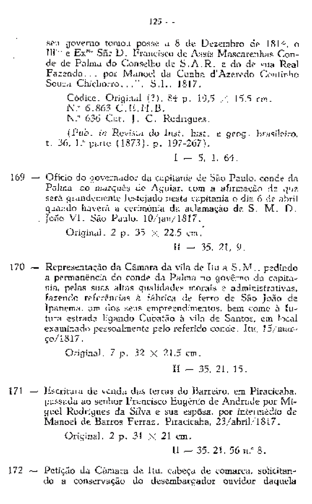 Representação da Câmara da vila de Itu a S.M. pedindo a permanência do Conde da Palma no governo da Capitania, pelas suas altas qualidades morais e administrativas, fazendo referências á fábrica de ferro de São João de Ipanema, um dos seus empreendimentos, bem como à futura estrada ligando Cubatão á vila de Santos, em local examinado pessoalmente pelo referido conde 15 de março de 1817, sábado. Atualizado em 25/02/2025 04:45:48 Relacionamentos • Cidades (4): Cubatão/SP, Itu/SP, Santos/SP, Sorocaba/SP • Pessoas (1) Marquês de São João da Palma (38 anos) • Temas (3): Caminho Santos-Cubatão, Estradas antigas, Fazenda Ipanema ![]()