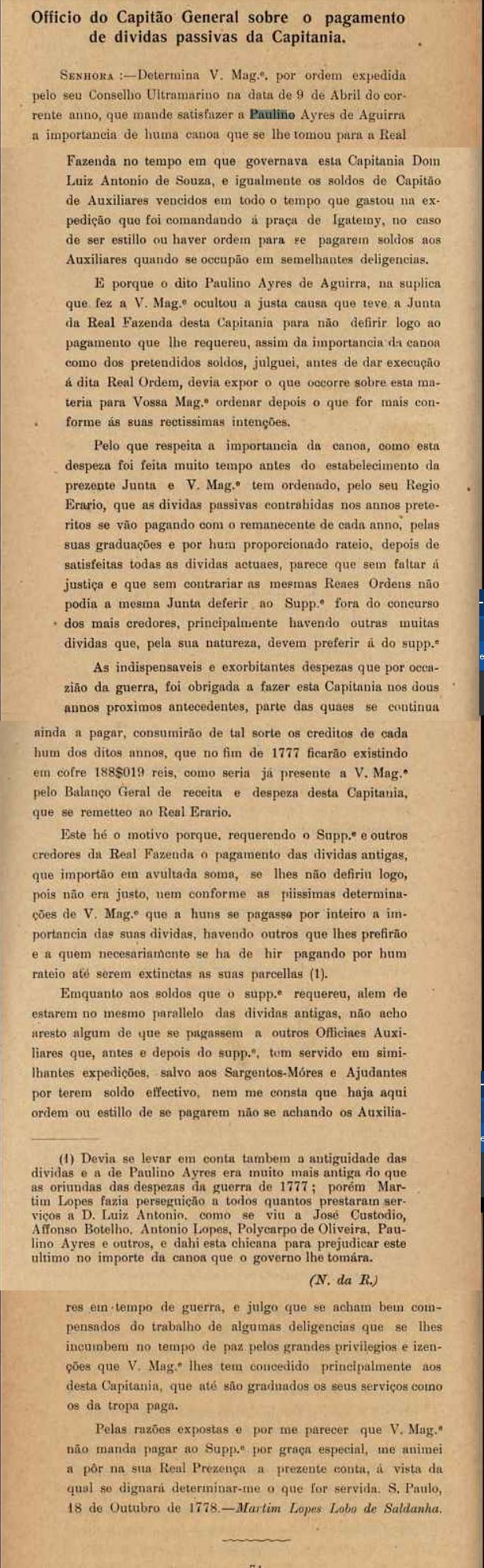 Paulino Aires de Aguirre escreve ao Governador queixando-se de José de Almeida Leme • Pessoas (4) Luís António de Sousa Botelho Mourão (303 anos) José de Almeida Leme (307 anos) Paulino Aires de Aguirre (290 anos) Salvador de Oliveira Leme (304 anos)