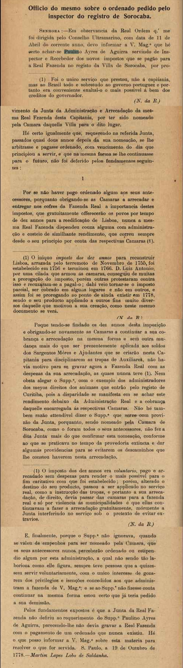 ORDEM RÉGIA, EXPEDIDA PELO CONSELHO ULTRAMARINO, DE 11 DE ABRIL DE 1778, INFORMA QUE PAULINO AIRES DE AGUIRRE É INSPETOR E RECEBEDOR DOS NOVOS IMPOSTOS DA REAL FAZENDA, NO REGISTRO DA VILA DE SOROCABA, POR TER SIDO NOMEADO PELA CÂMARA DAQUELA VILA PARA O DITO LUGAR • Pessoas (1) Paulino Aires de Aguirre (43 anos)