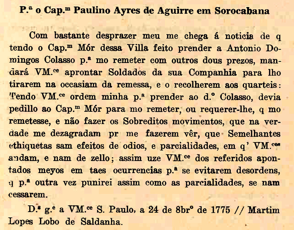 Carta para Paulino Ayres de Aguirra Tenente Coronel da Cavalaria Ligeira Auxiliar - Em Sorocaba • Pessoas (1) Paulino Aires de Aguirre (290 anos)