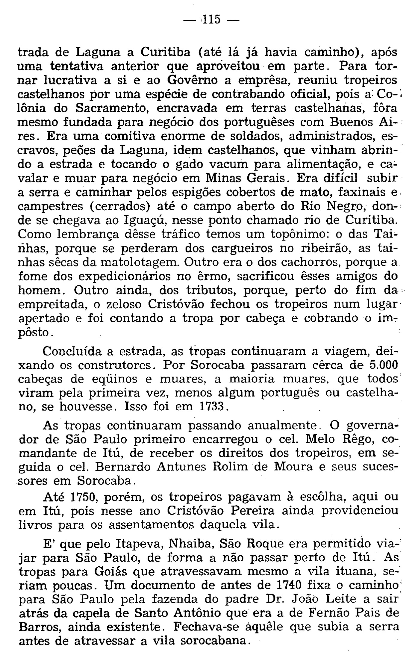 “Memória Histórica de Sorocaba, parte III”, 1965. Luís Castanho de Almeida (1904-1981) Setembro de 1965. Atualizado em 24/10/2025 03:34:19 Relacionamentos • Cidades (9): Ibiúna/SP, Itu/SP, Paranapanema/SP, Porto Feliz/SP, São Paulo/SP, São Roque/SP, Sorocaba/SP, Santos/SP, Cubatão/SP • Pessoas (5) Auguste de Saint-Hilaire (1779-1853), Jerônimo Côrte-Real, Luís Castanho de Almeida (61 anos), Salvador de Oliveira Leme (1721-1802), Cristovão Pereira de Abreu (1678-1755) • Temas (35): “o Rio Grande”, Avenida Nogueira Padilha, Avenida São Paulo, Boulevard Braguinha, Caminho de São Roque-Sorocaba, Caminho Fundo, Caminho Itú-Sorocaba, Ermidas, capelas e igrejas, Catedral / Igreja Matriz, Convento/Galeria Santa Clara, Córrego Supiriri, Estradas antigas, Inhayba, Itapeva (Serra de São Francisco), Lageado, Pelourinhos, Piragibu, Pontes, Praça Fernando Prestes, Ribeirão de Taquarivaí, Rua da Boa Vista, Rua da Penha, Rua Monsenhor João Soares, Rua Padre Luiz, Rua Santa Clara, Vila Hortência, Vila Santana / Além Linha, Nossa Senhora Aparecida, Bairro de Aparecidinha, Estrada do Ipatinga, Casa Doada, Caminho de Cubatão, Caminho do Mar, Rio Pinheiros, Terremotos ![]() • 1. Rua da Margem 1835 A rua que depois de 1805 ficou se chamando do Hospital, continuava até o rio e os animais podiam sair na ponte, mas por essa época os ricos proprietários da rua Sousa Pereira levaram seus quintais até a margem, precisando a Câmara abrir de nôvo a rua da Margem lá por 1835, é verdade que sem pagar. Dessa rua desciam dois caminhos para o Supirirí que com o da rua Padre Luís se reuniam no Caminho Fundo, única saída para Ipanema e Pôrto Feliz e os bairros do Ipatinga e Terra Vermelha. Todo o Supirirí era mato, depois capoeira, enfim brejo, onde a saparia coaxava...Não é fácil relatar os nomes, já não digo dos peões e domadores anônimos que moravam em ranchos de Sapé, de graça, nos campos reúnos, mas os dos primeiros sorocabanos que foram buscar bestas nos campos do sul, parece fora de dúvida, que foram membros da família Antunes Maciel, mostrando que mesmo genealogicamente a sucessão do bandeirante foi recolhida pelo tropeiro. [Página 121]