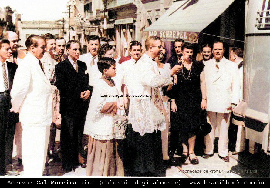 Rua São Bento Data: 01/01/1954 Créditos/Fonte: Gal Moreira Dini II / Antônio Carlos Sartorelli Prefeito Gualberto de terno branco, Olga Molineiro. Monsenhor Cangro, Padre Chiquinho, D Yole Riva Moreira, esposa do prefeito, e ao lado Sr. Emerenciano Prestes de Barros. Bar Schrepel à direita (ps) colorida d (£) (erl) (ppl) (pgm) gal moreira dini