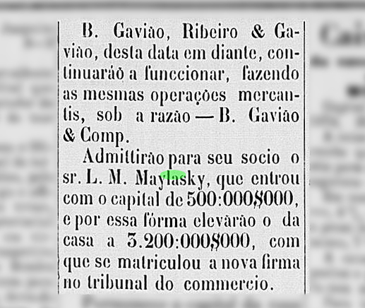 A empresa "B. Gavião, Ribeiro & Gavião" admitiram como sócio Luiz Matheus Maylasky, que entrou com o capital de 500:000$000, e por isso elevaram a casa a 3.200:000$000, com que se matriculou a nova firma no tribunal do comércio.
