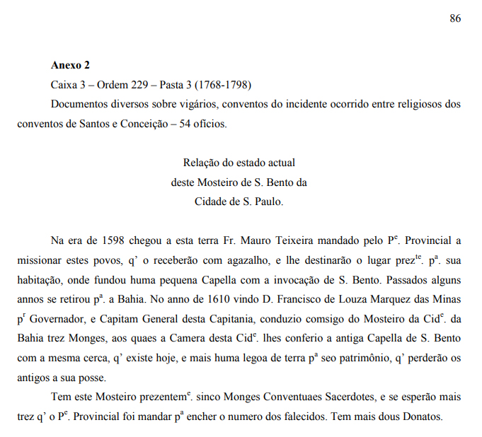 Na era de 1598 chegou a esta terra Fr. Mauro Teixeira mandado pelo Pe. Provincial a missionar estes povos, que o receberão com agazalho, e lhe destinarão o lugar prezte. pa. sua habitação, onde fundou huma pequena Capella com a invocação de S. Bento. Passados algunsannos se retirou pa. a Bahia. No anno de 1610 vindo D. Francisco de Louza Marquez das Minas pr Governador, e Capitam General desta Capitania, conduzio comsigo do Mosteiro da Cide. da Bahia trez Monges, aos quaes a Camera desta Cide. lhes conferio a antiga Capella de S. Bento com a mesma cerca, que existe hoje, e mais huma legoa de terra pa seo patrimônio, que perderão os antigos a sua posse.