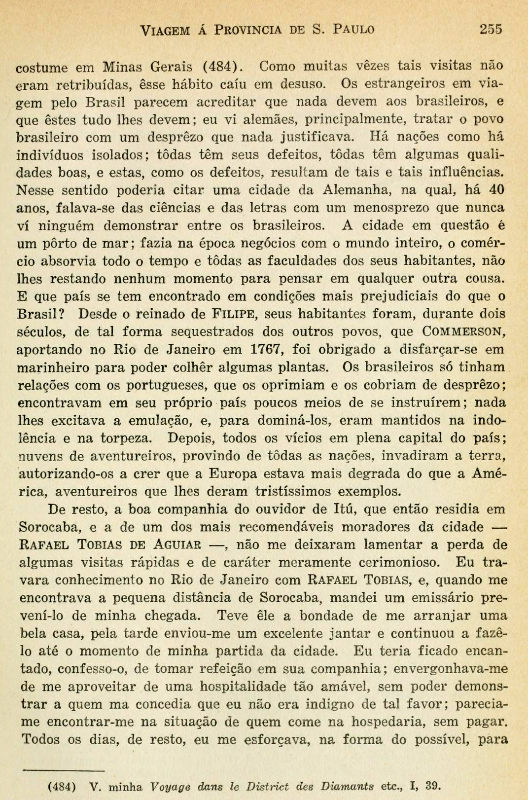 Antigamente, quando um estrangeiro chegava a Sorocaba, recebia a visita dos principais moradores da localidade, como, em 1813, ainda era costume em Minas Gerais (484). Como muitas vezes tais visitas não eram retribuídas, esse hábito caiu em desuso. Os estrangeiros em viagem pelo Brasil parecem acreditar que nada devem aos brasileiros, e que estes tudo lhes devem; eu vi alemães, principalmente, tratar o povo brasileiro com um desprezo que nada justificava. Há nações como há indivíduos isolados; todas têm seus defeitos, todas têm algumas qualidades boas, e estas, como os defeitos, resultam de tais e tais influências. Nesse sentido poderia citar uma cidade da Alemanha, na qual, há 40 anos, falava-se das ciências e das letras com um menosprezo que nunca vi ninguém demonstrar entre os brasileiros.A cidade em questão é um porto de mar; fazia na época negócios com o mundo inteiro, o comércio absorvia todo o tempo e todas as faculdades dos seus habitantes, não lhes restando nenhum momento para pensar em qualquer outra cousa. E que país se tem encontrado em condições mais prejudiciais do que o Brasil?Desde o reinado de Filipe, seus habitantes foram, durante dois séculos, de tal forma sequestrados dos outros povos, que Commerson, aportando no Rio de Janeiro em 1767, foi obrigado a disfarçar-se em marinheiro para poder colher algumas plantas. Os brasileiros só tinham relações com os portugueses, que os oprimiam e os cobriam de desprezo; encontravam em seu próprio país poucos meios de se instruírem; nada lhes excitava a emulação, e, para dominá-los, eram mantidos na indolência e na torpeza. Depois, todos os vícios em plena capital do país; nuvens de aventureiros, provindo de todas as nações, invadiram a terra, autorizando-os a crer que a Europa estava mais degrada do que a América, aventureiros que lhes deram tristíssimos exemplos. (Página 254)