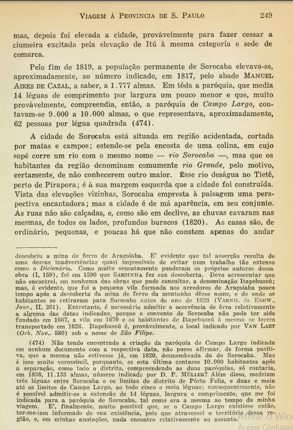 É evidente que tal asserção resulta de uma dessas inadvertências quasi impossíveis de evitar num trabalho tão extenso como o Dicionário. Como muito sensatamente ponderam os próprios autores dessa obra (l, 159), foi em 1590 que Sardinha fez sua descoberta. Devo acrescentar que não encontrei, em nenhuma das obras que pude consultar, a denominação Itapebussú; mas, é evidente, que foi a pequena vila fonuada nos arredores de Araçoiaba pouco tempo após a descoberta da mina de ferro da montanha desse nome, e de onde os habitantes se retiraram para Sorocaba antes do ano de 1626 (Varnh. in EsHW., Jour., II, 261). Entretanto, é necessário admitir a ocorrência de erro relativamente a alguma das datas indicadas, porque o convento de Sorocaba não pode ter sido fundado em 1667, a vila em 1670 e os habitantes de Itapebussú à mesma se terem transportado em 1626. Itapebussú é, provavelmente, o local indicado por Van Laet {Orh. Nov., 580) sob o nome de São Filipe. (Página 249)