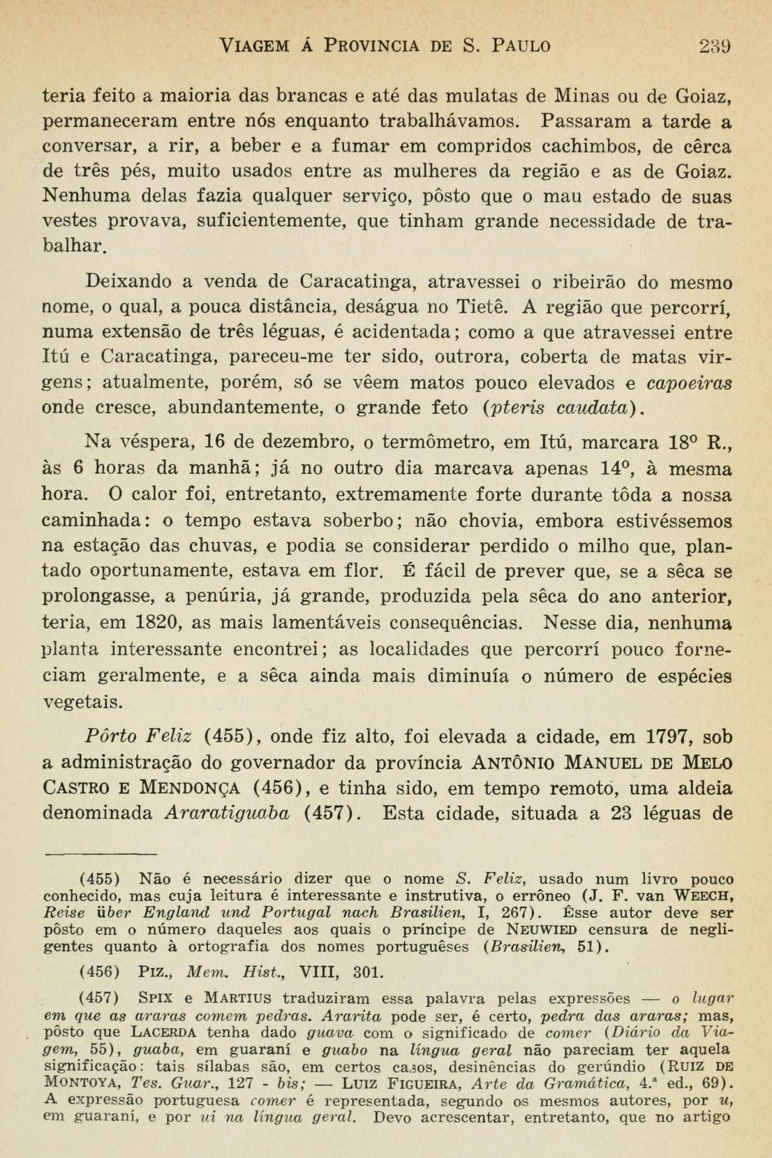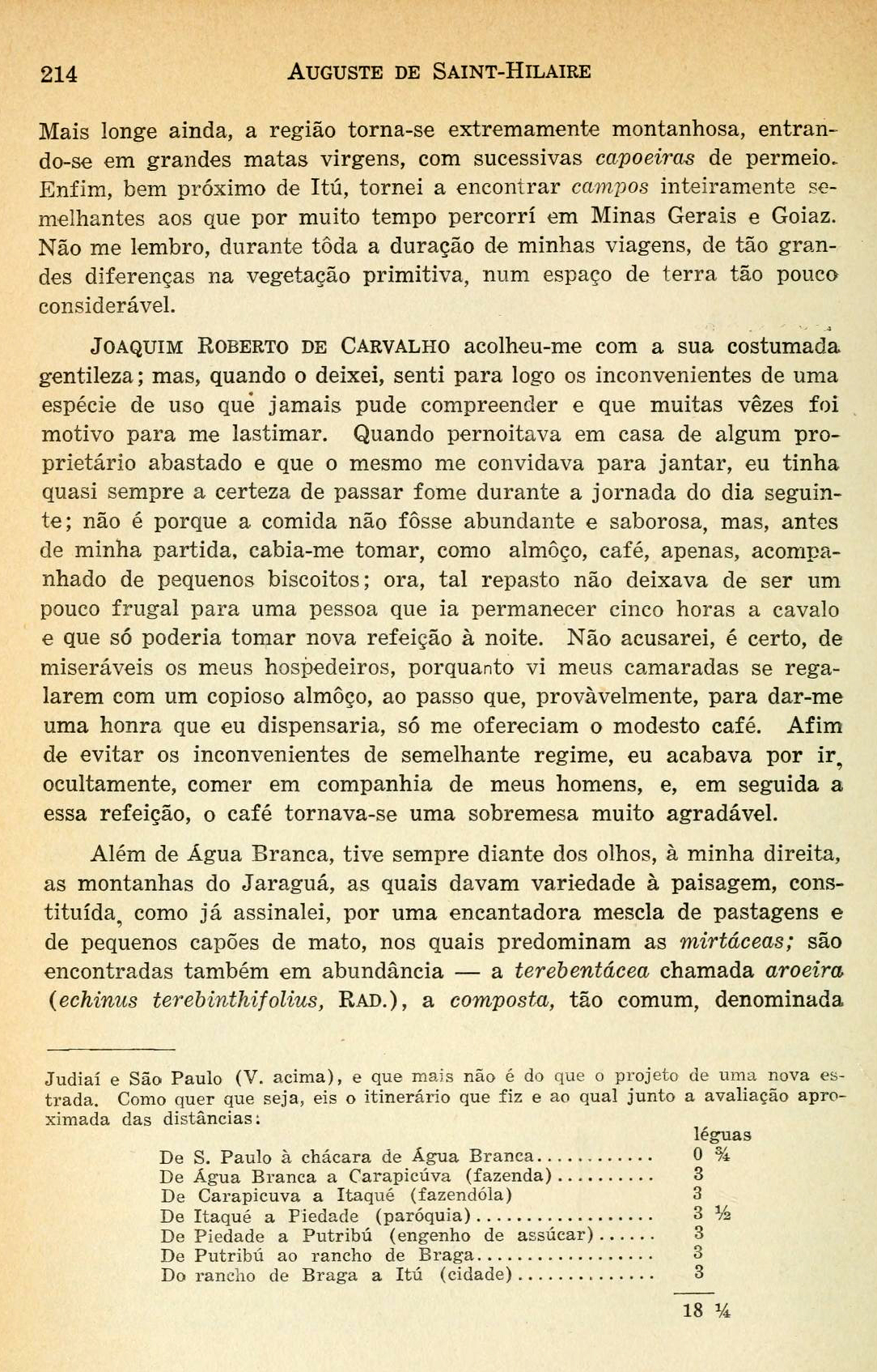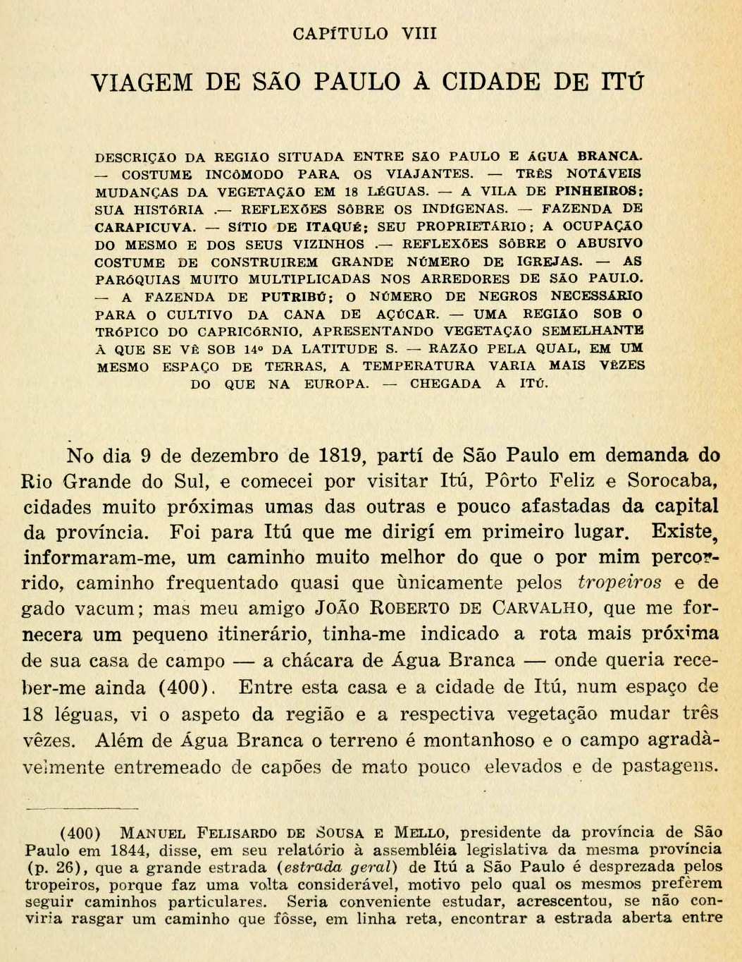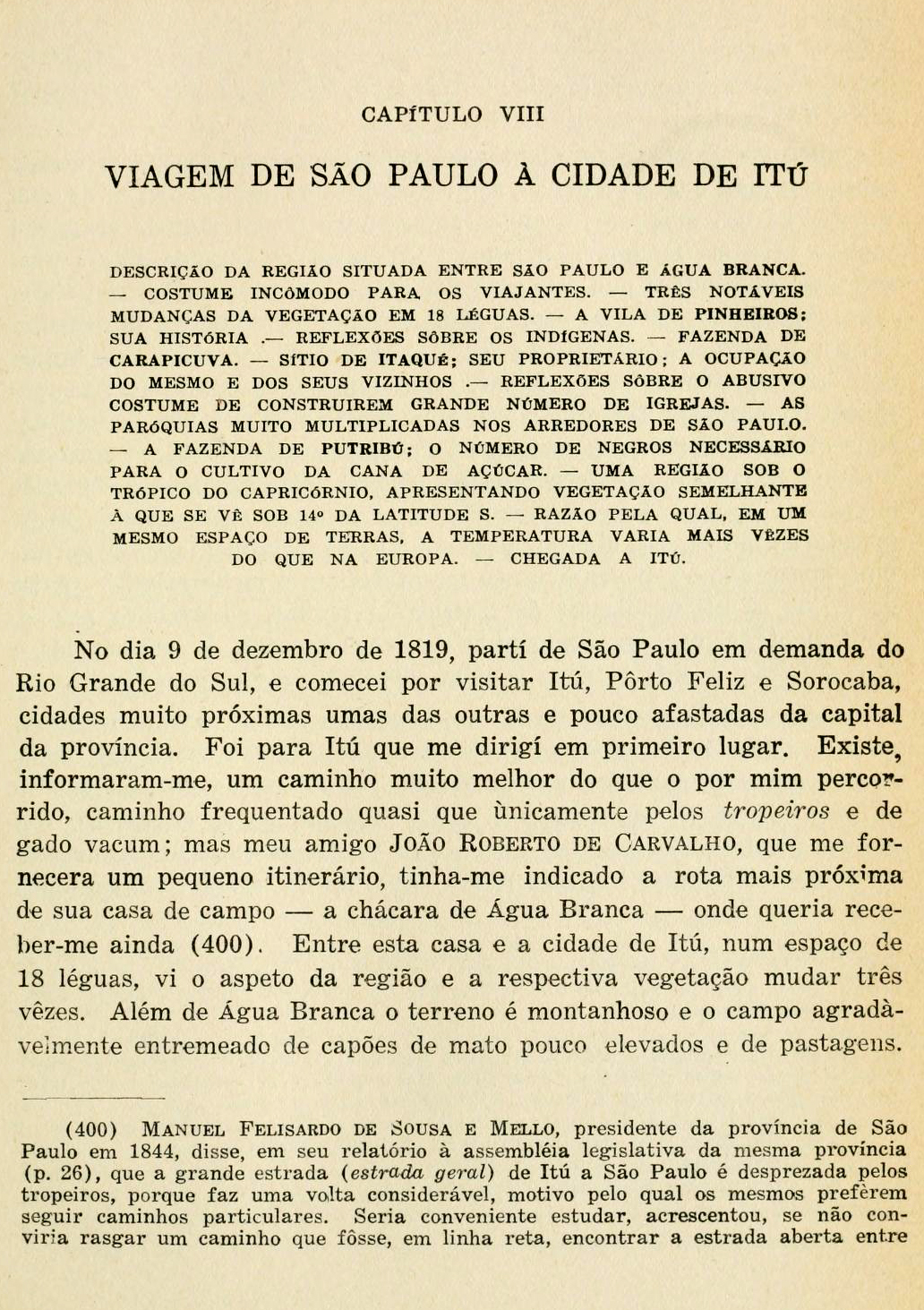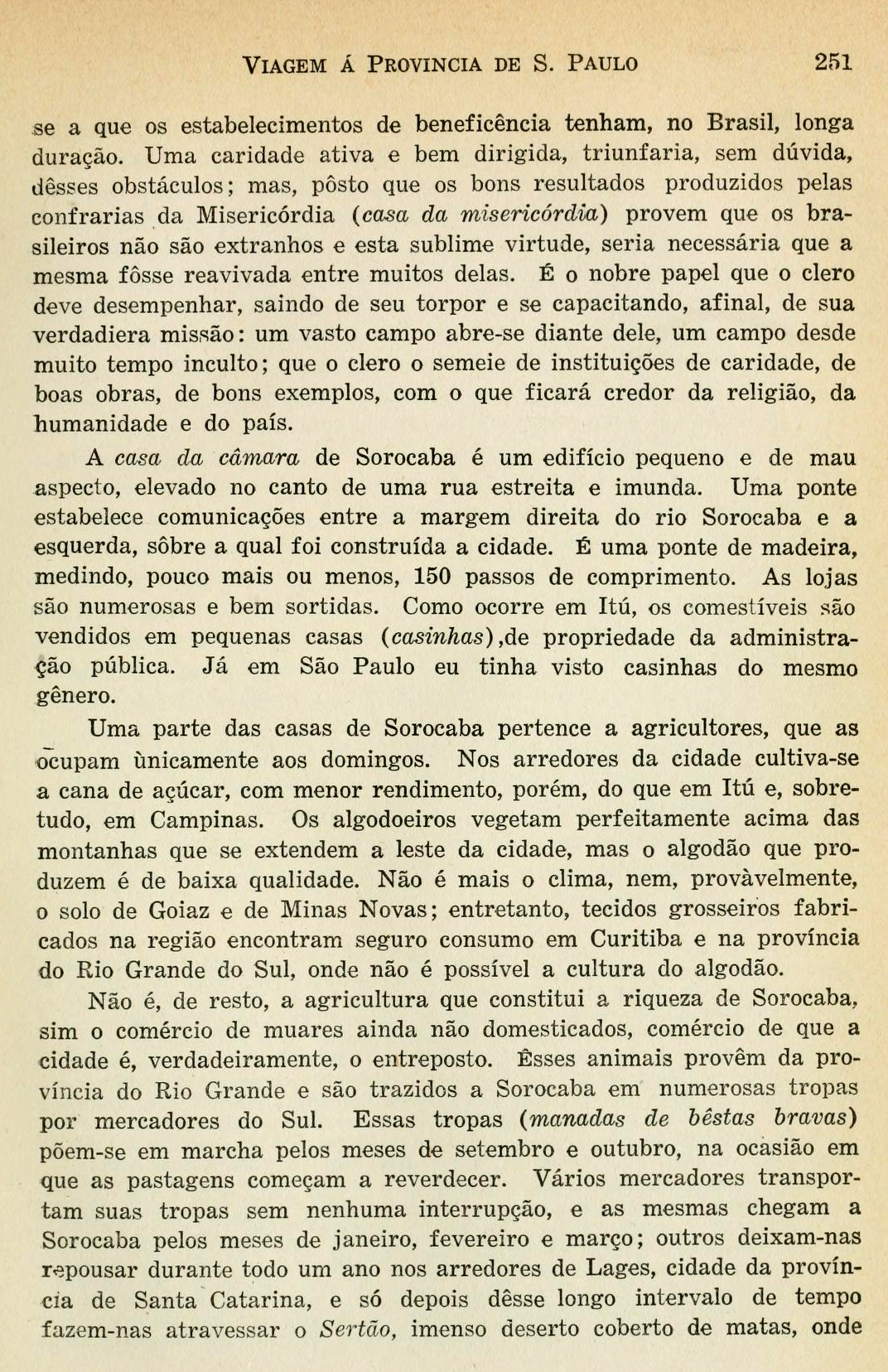 No dia 9 de dezembro de 1819, parti de São Paulo em demanda do Rio Grande do Sul, e comecei por visitar Itú, Porto Feliz e Sorocaba, cidades muito próximas umas das outras e pouco afastadas da capital da província. Foi para Itú que me dirigi em primeiro lugar. Existe, informaram-me, um caminho muito melhor do que o por mim percorrido, caminho frequentado quase que unicamente pelos tropeiros e de gado vacum; mas meu amigo João Roberto de Carvalho, que me fornecera um pequeno itinerário, tinha-me indicado a rota mais próxima de sua casa de campo [Página 213]