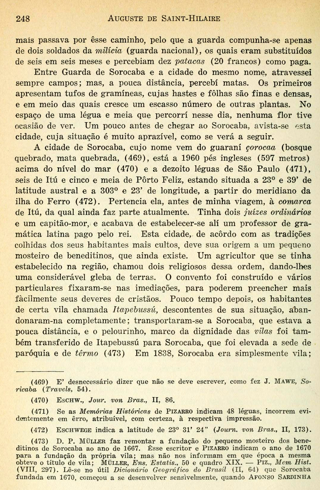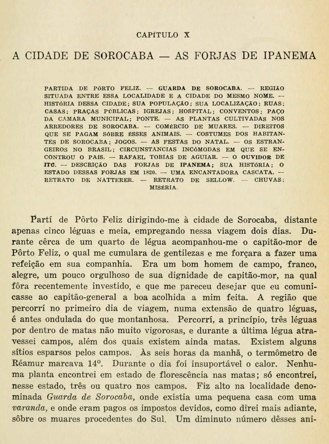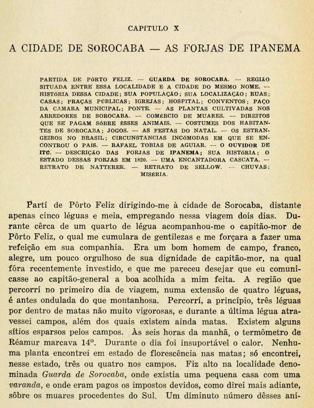 Partí de Porto Feliz dirigindo-me à cidade de Sorocaba, distante apenas cinco léguas e meia, empregando nessa viagem dois dias. Durante cerca de um quarto de légua acompanhou-me o capitão-mór de Porto Feliz, o qual me cumulara de gentilezas e me forçara a fazer uma refeição em sua companhia. Era homem de campo, franco, alegre, um pouco orgulhoso de dignidade de capitão=mór, naa qual fora recentemente investido, e que me pareceu desejar que eu comunicasse ao capitão-general a boa acolhida a mim feita.