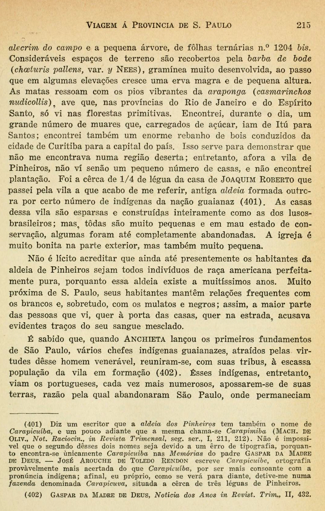 Não é lícito acreditar que ainda até presentemente os habitantes da aldeia de Pinheiros sejam todos indivíduos de raça americana perfeitamente pura, porquanto essa aldeia existe a muitíssimo anos. Muito próxima de São Paulo, seus habitantes mantem relações frequentes com os brancos e, sobretudo, com os mulatos e negros; assim, a maior parte das pessoas que vi, quer à porta das casas, quer na estrada, acusava evidentes traços do seu sangue mesclado.