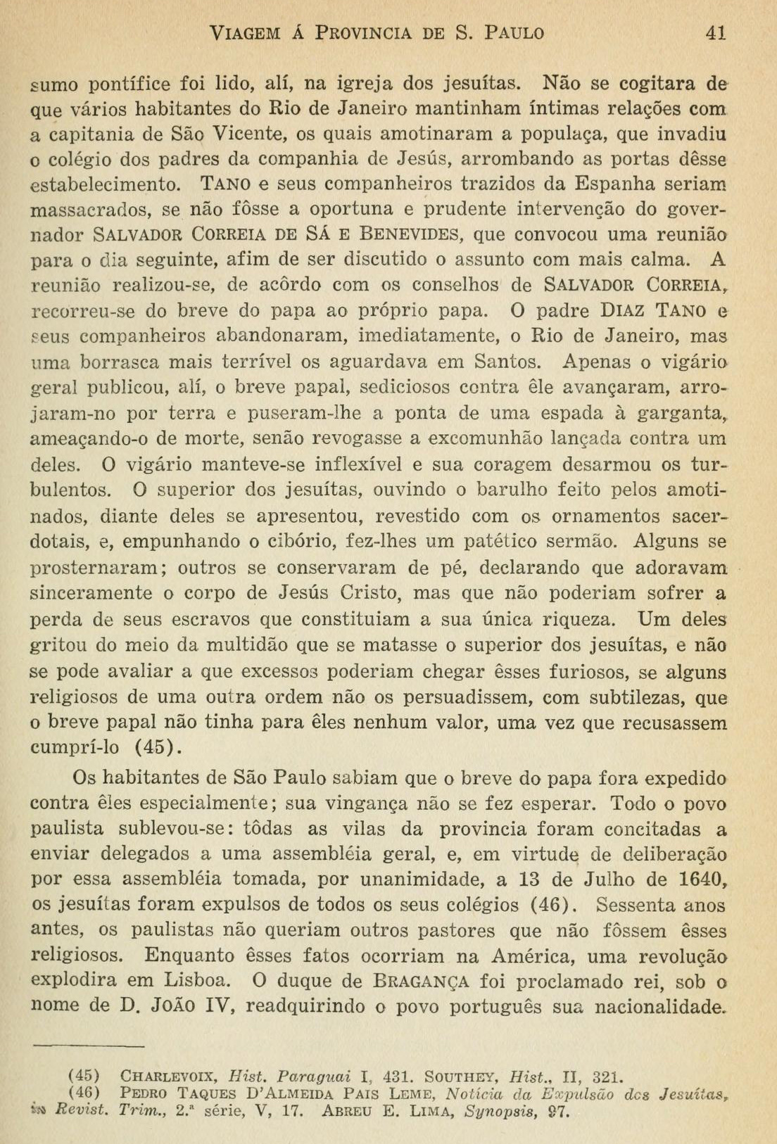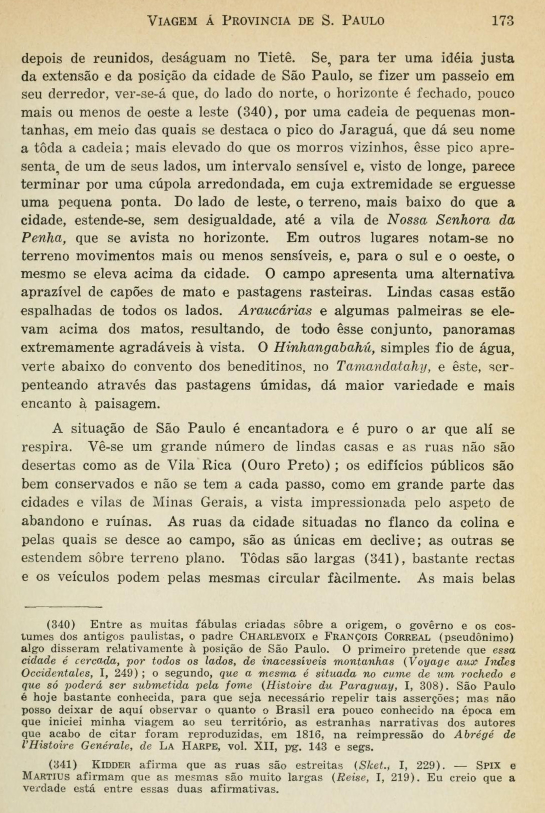 Entre as muitas fábulas criadas sobre a origem, o governo e os costumes dos antigos paulistas, o padre Charlevoix e François Correal (pseudônimo) algo disseram relativamente à posição de São Paulo. O primeiro pretende que "essa cidade é cercada, por todos os lados, de inacessíveis montanhas" (Voyage aux Indes Occidentales, I, 249); ; e o segundo, "que a mesma é situada no cume de um rochedo e que só poderá ser submetida pela fome" (Histoire du Paraguay, I, 308). [Página 173]