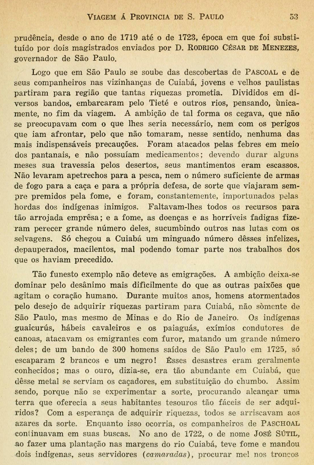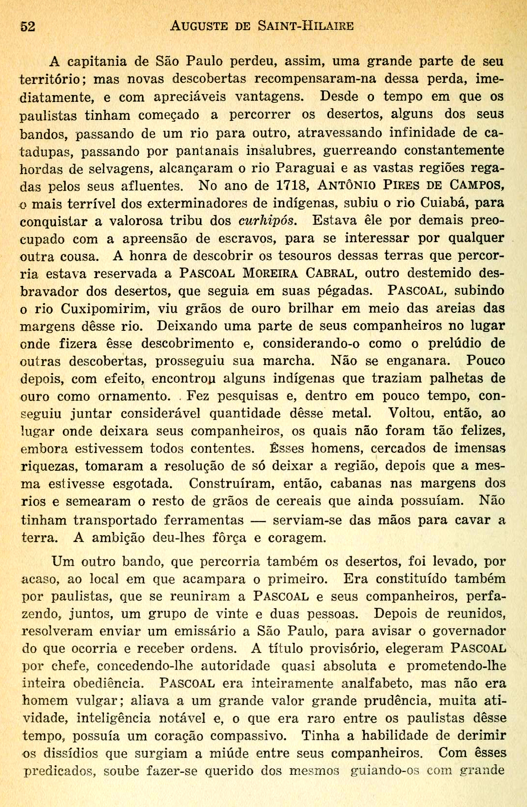 Pascoal por chefe, concedendo-lhe autoridade quasi absoluta e prometendo-lhe inteira obediência. Pascoal era inteiramente analfabeto, mas não era homem vulgar; aliava a um grande valor grande prudência, muita ati- vidade, inteligência notável e, o que era raro entre os paulistas desse tempo, possuía um coração compassivo. Tinha a habilidade de derimir os dissídios que surgiam a miúde entre seus companheiros. Com esses predicados, soube fazer-se querido dos mesmos guiando-os com grande prudência, desde o ano de 1719 até o de 1723, época em que foi substituído por dois magistrados enviados por D. Rodrigo César de Menezes, governador de São Paulo. [“Viagem à provincia de São Paulo e Resumo das viagens ao Brasil, provincia Cisplatina e missões do Paraguai”. Auguste de Saint-Hilaire (1779-1853). Páginas 52 e 53]