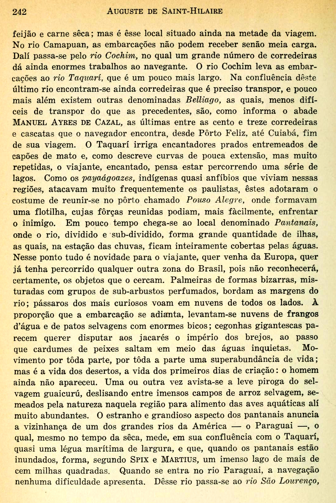 Parecerá extraordinário, à primeira vista, que, encontrando-me sob o trópico do Capricórnio, se me apresentassem quase que as mesmas plantas existentes aos 14 graus de latitude; mas, não se deve esquecer de que, a grandes distâncias, a vegetação se reproduz sob a mesma forma, seja no sentido dos meridianos, seja no dos paralelos, quando, além disso, são análogas as condições: (...) (Página 224)Esta rápida notícia bastará para mostrar quão perigosa é essa navegação, quasi tão longa quanto a da Europa às índias Orientais. Tãoperseverantes, quanto intrépidos, os antigos paulistas afrontavam todosos perigos : não temiam nem a flecha dos selvagens, nem a fome, nem as intempéries das estações, nem a falta de repouso, nem as privações detoda a sorte, nem mesmo as moléstias pestilentas, que, entretanto, dizi- maram, em meio daquelas regiões desertas, tão grande número de seus primeiros exploradores.