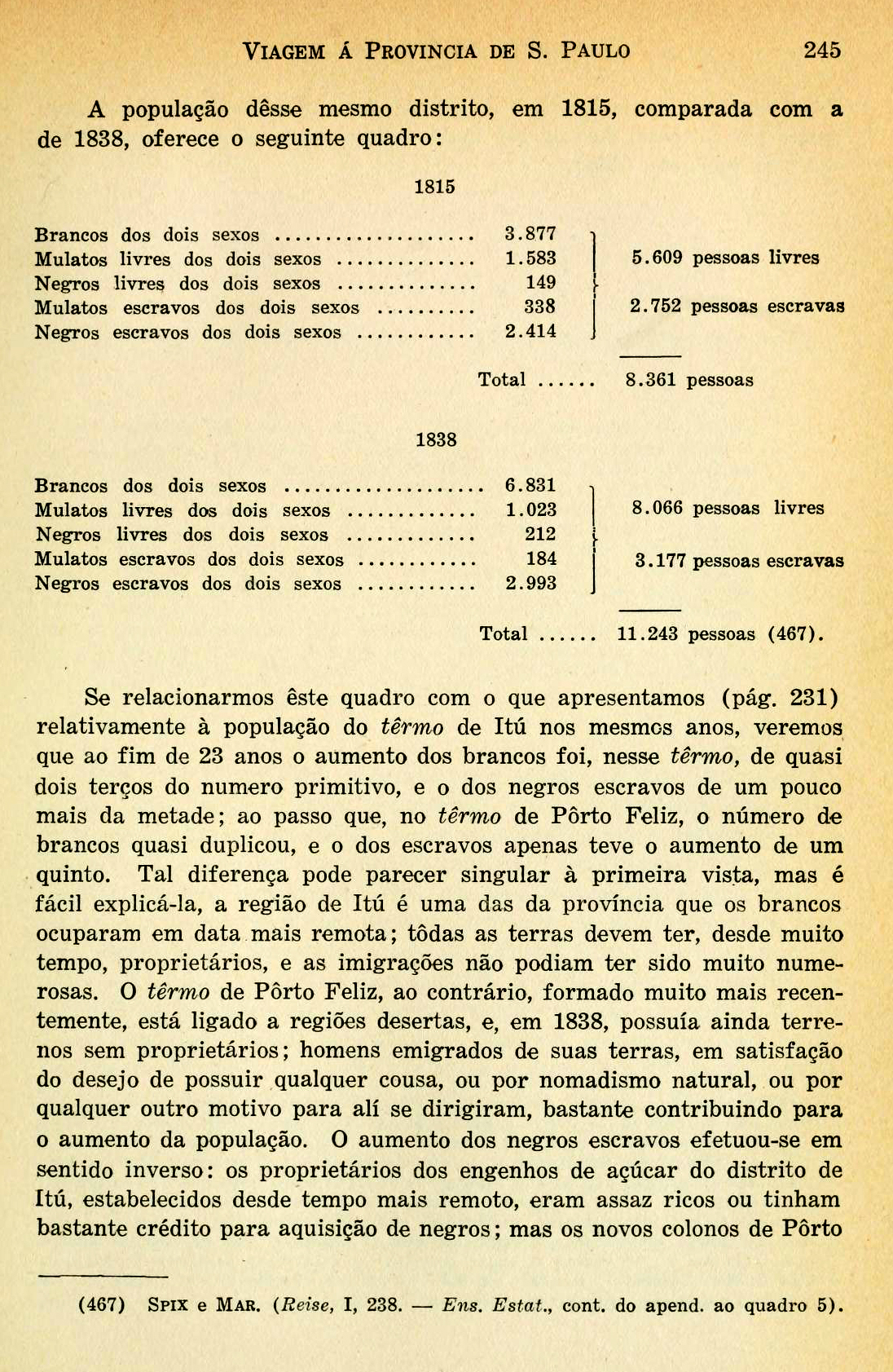 Se relacionarmos este quadro com o que apresentamos (pág. 231)relativamente à população do termo de Itú nos mesmos anos, veremosque ao fim de 23 anos o aumento dos brancos foi, nesse termo, de quasidois terços do numero primitivo, e o dos negros escravos de um poucomais da metade; ao passo que, no termo de Porto Feliz, o número debrancos quasi duplicou, e o dos escravos apenas teve o aumento de umquinto. Tal diferença pode parecer singular à primeira vista, mas éfácil explicá-la, a região de Itú é uma das da província que os brancosocuparam em data mais remota; todas as terras devem ter, desde muitotempo, proprietários, e as imigrações não podiam ter sido muito numerosas.