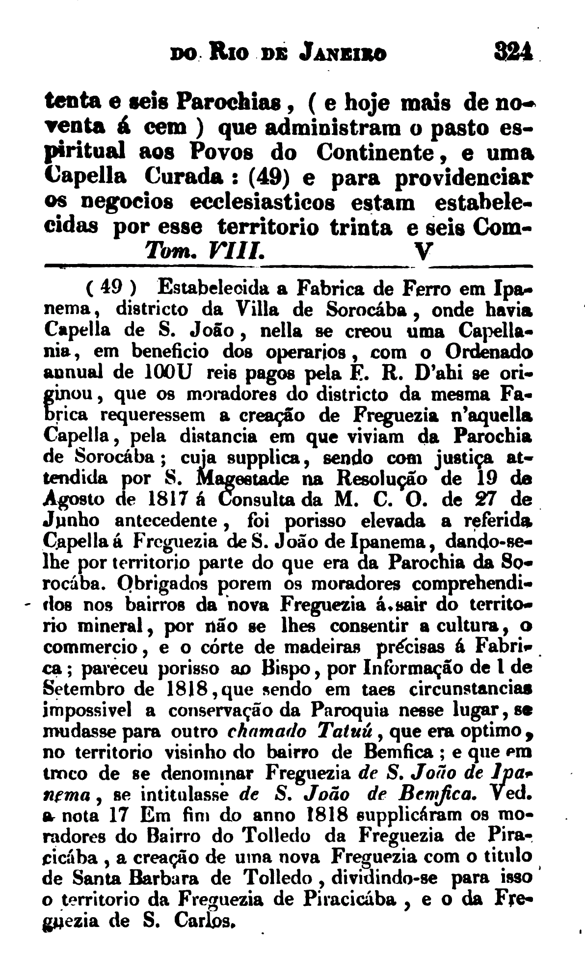 Estabelecida a Fábrica de Ferro em Ipanema, distrito da Vila de Sorocaba, onde havia Capela de São João, nela se criou uma Capellania, em benefício dos operários, com o Ordenado anual de 100U reais pagos pela F. R. Daí se originou, que os moradores do distrito da mesma Fábrica requeressem a criação de Frequezia naquela Capella, pela distância em que viviam da Paróquia de Sorocaba; cuja suplica, sendo com justiça atendida por S. Magestade na Resolução de 19 de agosto de 1817 á Consulta da M. C. O. de 27 de junho antecedente, foi por isso elevada a referida Capella á Freguezia de São João de Ipanema, dando-se-lhe por território parte do era da Paroquia da Sorocaba. Obrigados porém os moradores da Paróquia á sair do território mineral, por não se lhes consentir a cultura, o comércio, e o corte de madeiras precisas á Fabrica; pareceu por isso ao Bispo, por informação de 1 de setembro de 1818, que sendo em tais circunstâncias impossível a conservação da Paróquia nesse lugar, se mudasse para outro chamado Tatuú, que era ótimo, no território do bairro de Bemfica; e que em troco de se denominar Freguezia de São João de Ipanama, se intitulasse de São João de Bemfica. [Páginas 324]