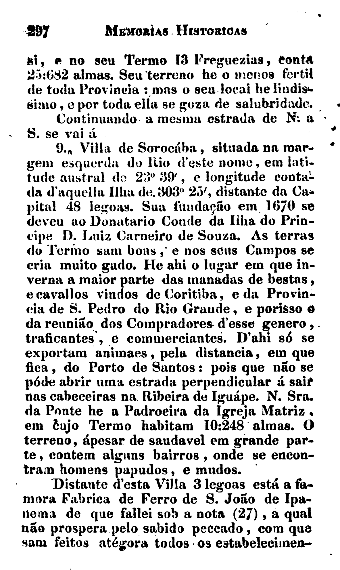 Distante desta vila 3 léguas está a famosa Fábrica de Ferro de São João de Ipanema de que falei sob a nota (27), a qual não prospera pelo sabido pecado, com que são feitos até agora todos os estabelecimentos portugueses.[Páginas 297 e 298]