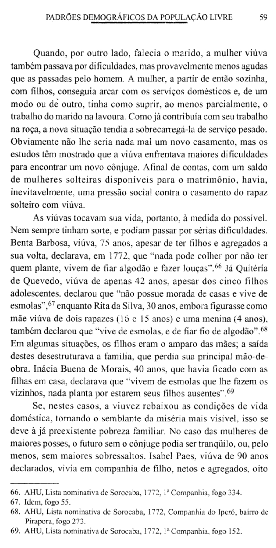 As viúvas tocavam sua vida, portanto, à medida do possível. Nem sempre tinham sorte, e podiam passar sérias dificuldades. Benta Barbosa, viúva, 75 anos, apesar de ter filhos e agregados a sua volta, declarava, em 1772, que “Nada pode colher por não ter quem planete, vivem de fiar algodão e fazer louças”.