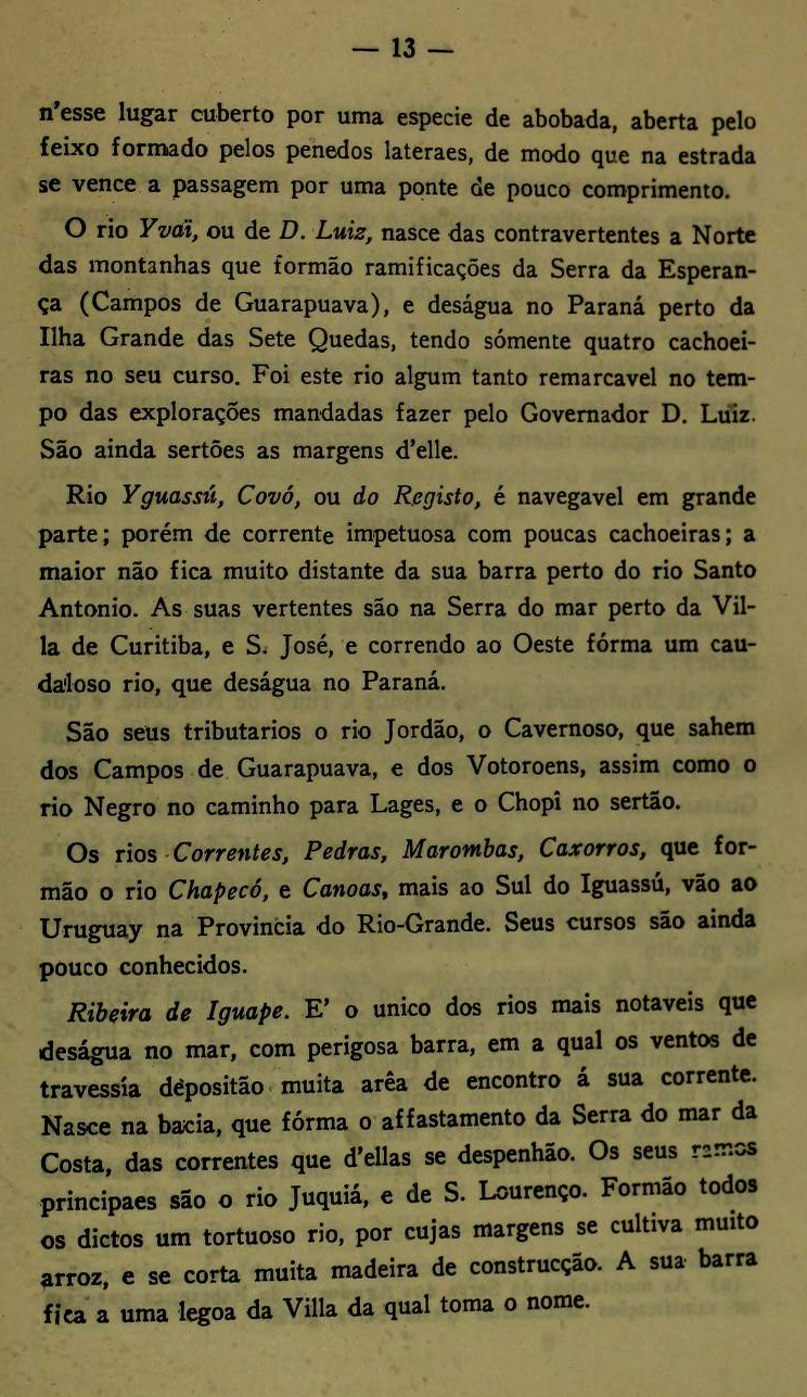 Nota-se a particularidade em um dos ramos do rio Tibagí (denominado Itararé) o correr submergido, ou por leito subterrâneo, em grande espaço, sendo nesse lugar coberto por uma espécie de abobada, aberta pelo feixo formado pelos penedos laterais, de modo que na estrada se vence a passagem por uma ponte de pouco comprimento. (Páginas 12 e 13)