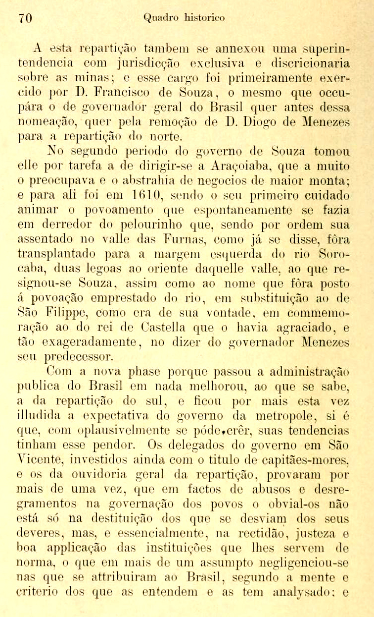 No segundo período do governo de Souza tomou ele por tarefa a de dirigir-se a Araçoiaba, que a muito o preocupava e o abstraia de negócios de maior monta; e para ali foi em 1610, sendo o seu primeiro cuidado animar o povoamento que espontaneamente se fazia em derredor do pelourinho que, sendo por ordem sua assentado no vale das Furnas, como já disse, fôra transplantado para a margem esquerda do rio Sorocaba, duas léguas ao oriente daquele vale, ao que resignou-se Souza, assim como ao nome que fora posto á povoação emprestado do rio, em substituição ao de São Filippe, como era de sua vontade, em comemoração ao do rei de Castella que o havia agraciado, e tão exageradamente, no dizer do governador Menezes [Página 70]