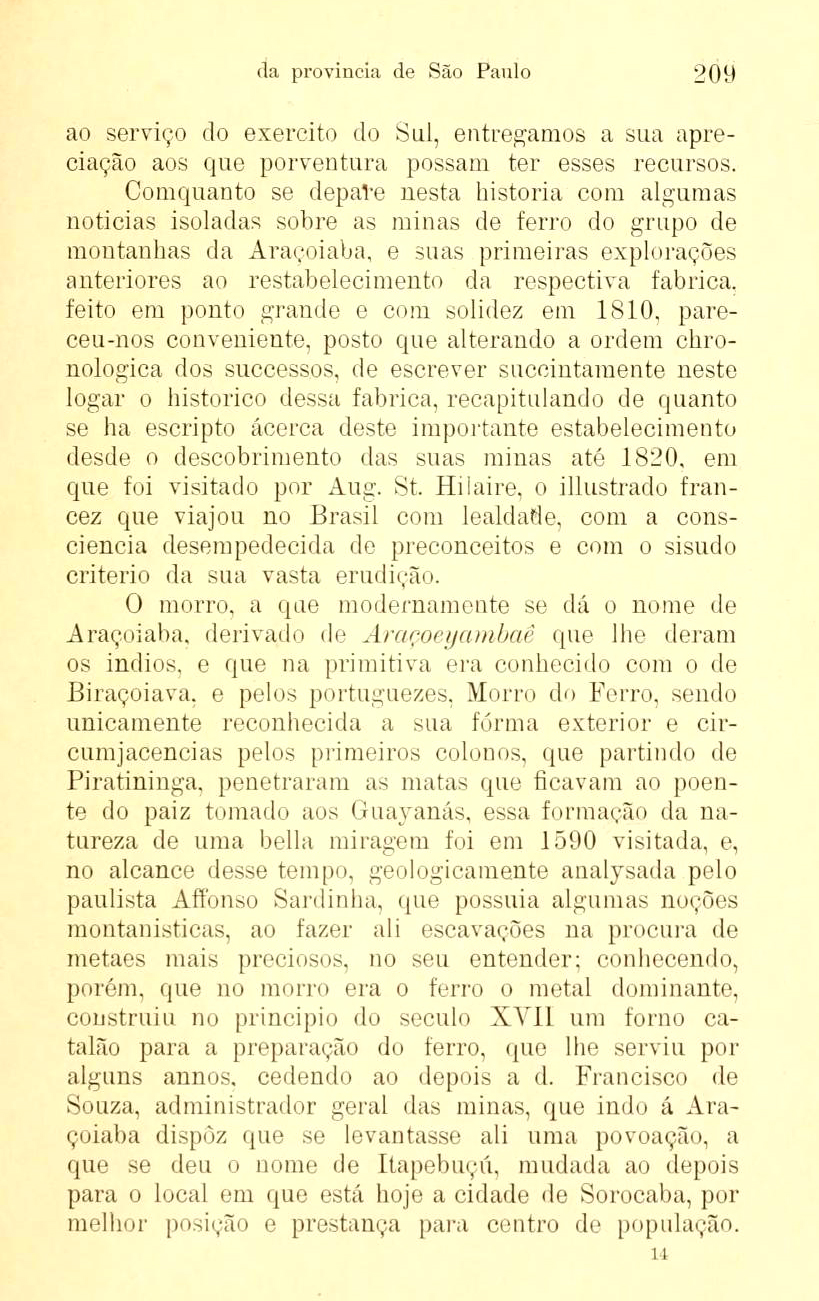 Antes da carta régia de 19 de agosto de 1799 nenhuma regularidade havia na exploração as minas de ferro que era pejado o morro de Araçoiaba no distrito de Sorocaba. Ás vezes trabalhava-se ali mais com a intuição de deparar-se com outro ou prata, que se dizia em aliagem com o ferro, do que na elaboração deste metal, mais útil e mais vantajoso do que outro qualquer, e cuja profusão ali era assaz reconhecida. [Página 186]