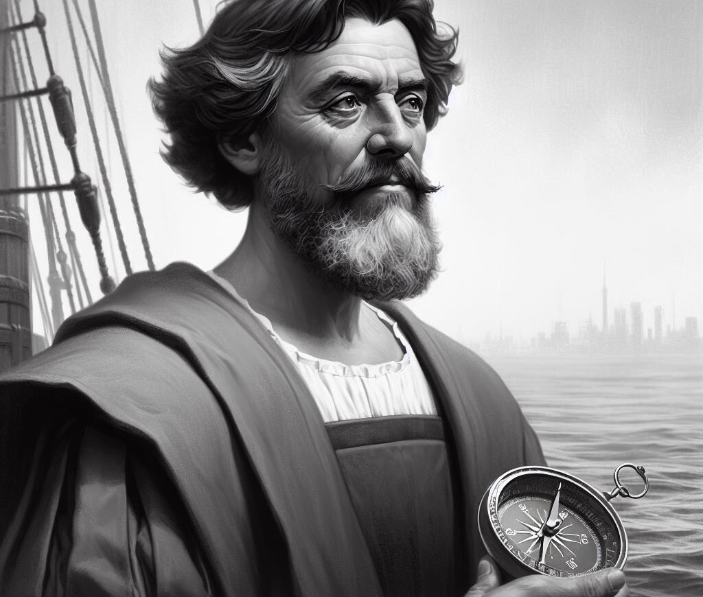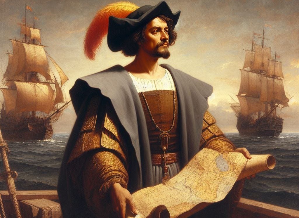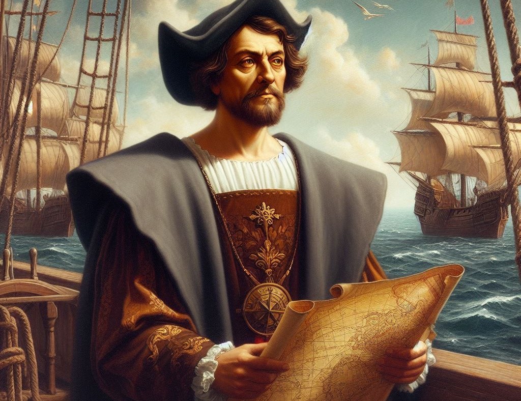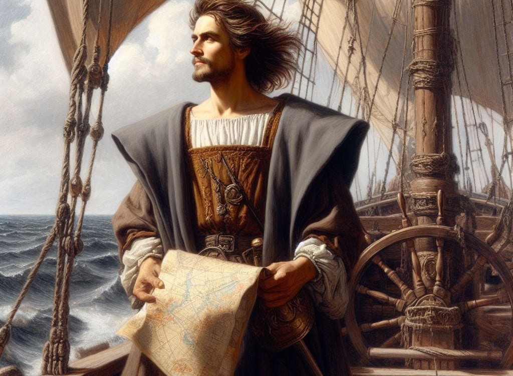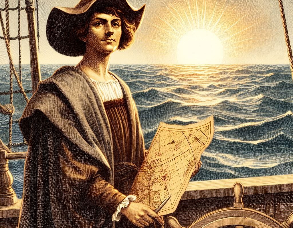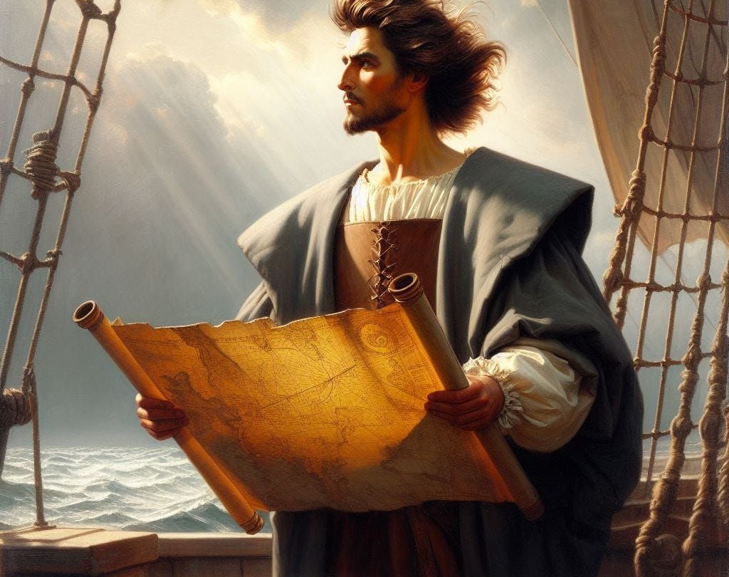 Cristóvão Colombo as 29 anos de idade, com um bebê no colo