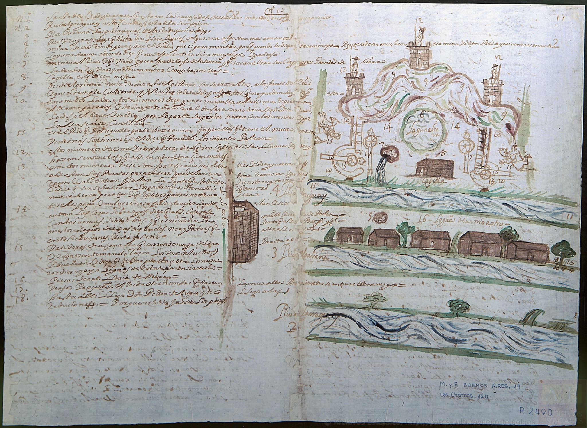 10- En ambos lados estos números dice que es muralla altísima de piedras. Él llama paredes y de ancho señaló en el bufete como vara y media y así lo dijo el vara y media y por la parte superior cierra con los montes y por la inferior con el río.