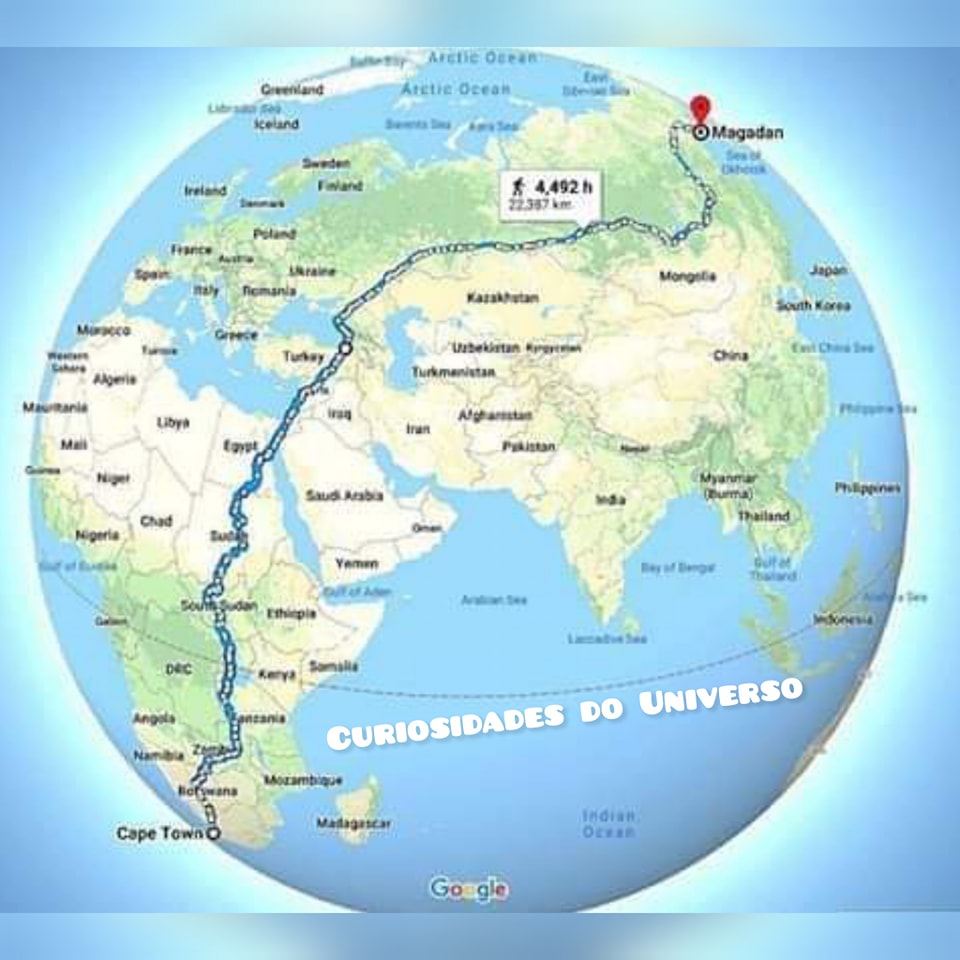 O caminho mais longo do mundo a pé sem a necessidade de atravessar o oceano ou qualquer outra barreira significativa é da Cidade do Cabo (África do Sul) a Magadan (Rússia). Não há necessidade de aviões ou barcos e existem pontes. São 21.808 km e demora em média andando 4.310 horas para percorrer. Seriam 187 dias caminhando sem parar, ou 561 dias caminhando 8 horas por dia. Ao longo do percurso, você passa por 17 países, seis fusos horários e todas as estações do ano.